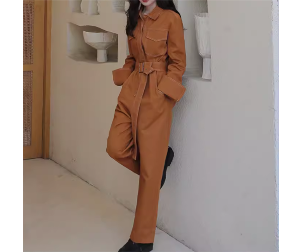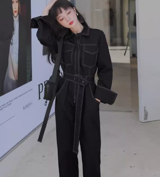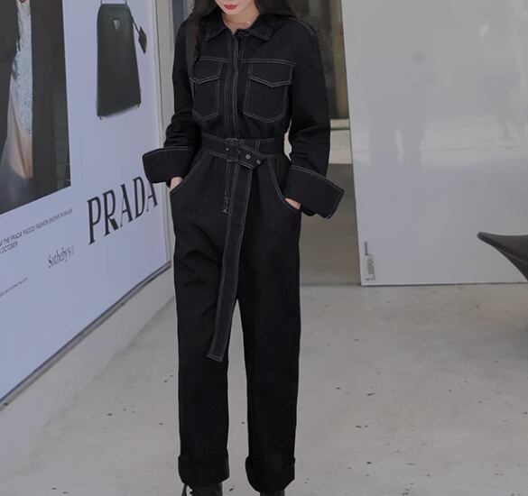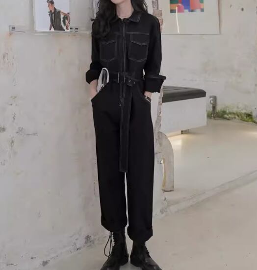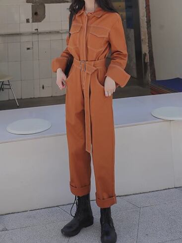 レディース パンツ オールインワン つなぎ 9分丈 アンクル丈 フルレングス 長袖 襟付き ポロカラー ベルト ウエストマーク ポケット ハイウエスト 異国風 かわいい 大人可愛い シンプル カジュアル おしゃれ かっこいい レトロ ボーイッシュ ルーズ クール ラグジュアリー 無地 春 秋 デート お出かけ 韓国 体型カバー 脚長 普段使い S M L XL 大きいサイズ ゆったり ブラック ブラウン