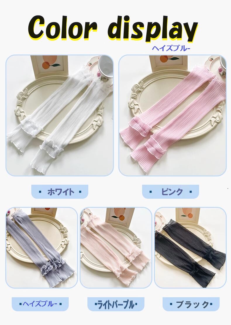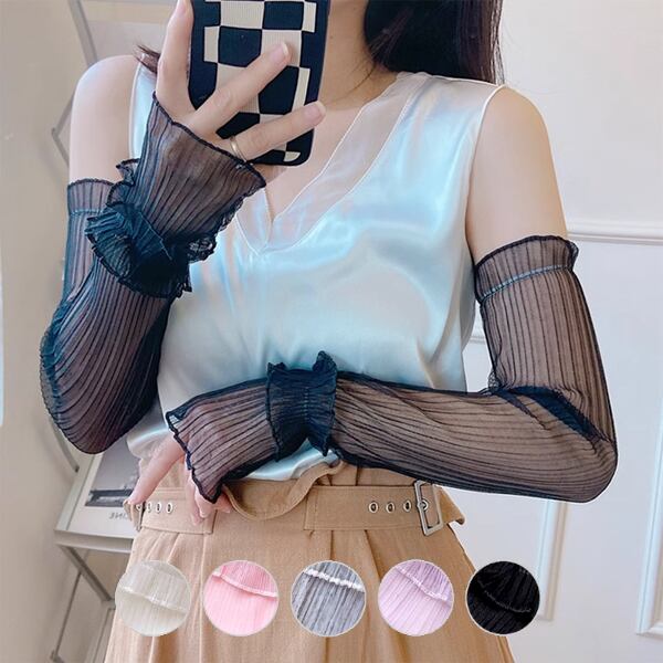 全5色 レディース アームカバー アームスリーブ サイクリングスリーブ アクセサリー ストレート アームウォーマー 二の腕カバー 日焼け防止 UVカット 紫外線対策 薄手 透け感 シースルー フリル付き 大人可愛い 上品 おしゃれ エレガント 無地 夏 20代 30代 通勤 お出かけ ビーチ 公園 ガーデン ドライブ スタイルアップ