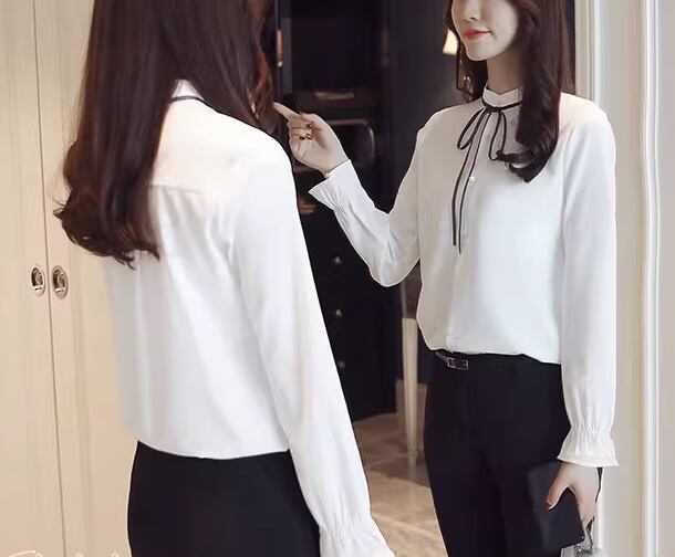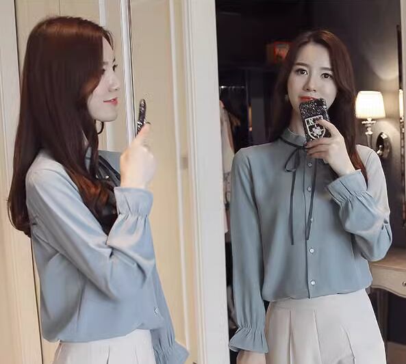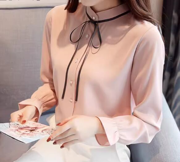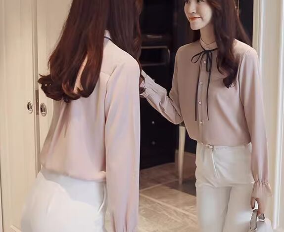 細めのさりげないリボンが大人可愛い長袖のシフォンシャツ。