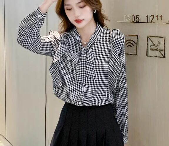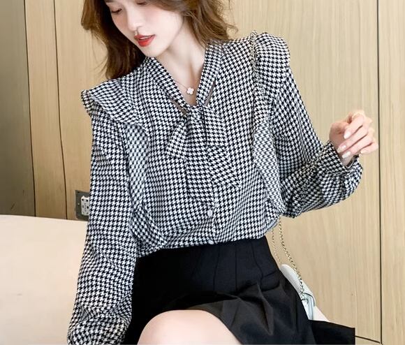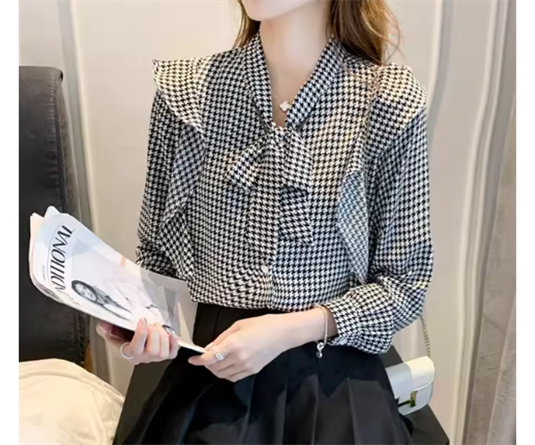 ブラック×ホワイトのシックな色使いの千鳥格子柄が大人可愛い長袖シャツ。