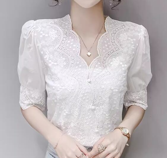 レディース トップス シャツ カットソー Tシャツ ミドル丈 半袖 5分袖 Vネック フェミニン レース フリル ボタン 薄手 かわいい 大人可愛い きれいめ カジュアル 上品 おしゃれ レトロ ガーリー ルーズ エレガント キュート ラグジュアリー 豪華 清潔感 シック 高級感 芸術的 アーティスティック 華やか 夏 デート お出かけ 体型カバー 普段使い 着回し 清楚 S M L XL 大きいサイズ ゆったり ホワイト