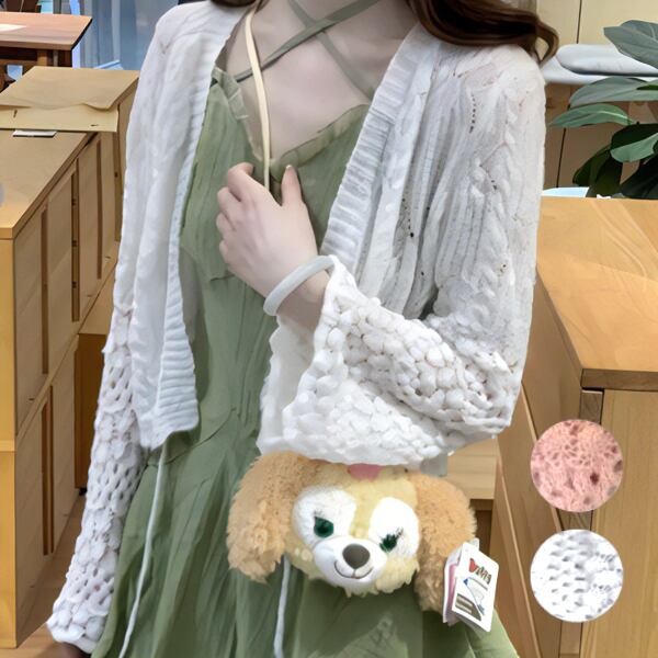 薄手でショート丈のニットカーディガン。春と夏に最適な長袖の日焼け止めショールです。軽量で通気性があり、スタイリッシュなデザインが魅力。どんなコーディネートにも合わせやすく、紫外線対策にも効果的です。