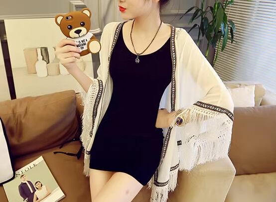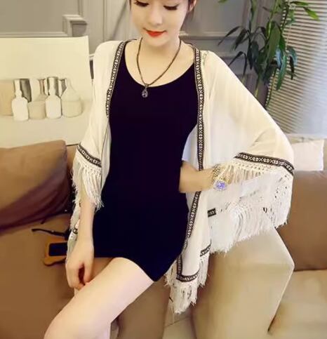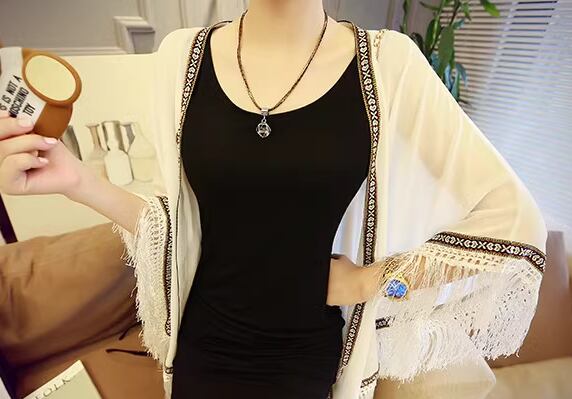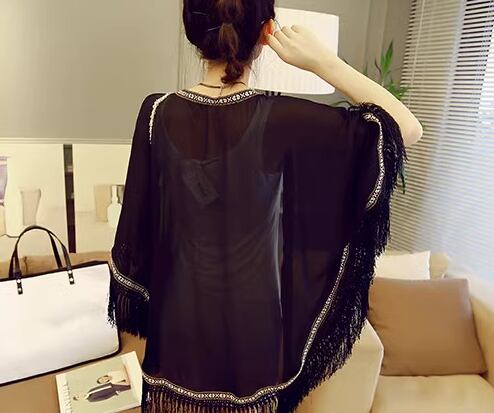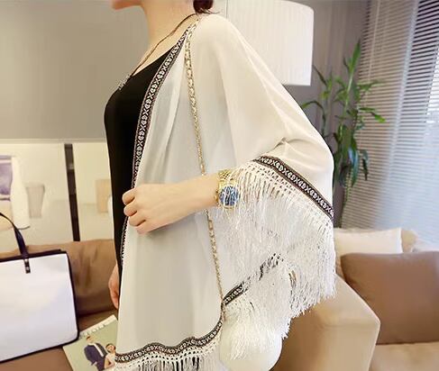 レディース トップス ジャケット カーディガン アウター 上着 羽織 ポンチョ ショール ミドル丈 7分袖 シフォン 前開き 異国風 フリンジ かわいい 大人可愛い シンプル カジュアル おしゃれ かっこいい こなれ感 エレガント キュート ラグジュアリー セレブリティ シック 高級感 夏 デート お出かけ 韓国 体型カバー 普段使い 着回し 日焼け防止 日焼け対策 冷房対策 フリーサイズ ホワイト ブラック