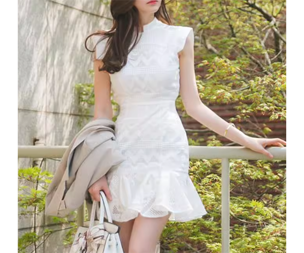 美しいシルエットとアーティスティックなレースの模様が魅力的なノースリーブのショート丈ワンピース。