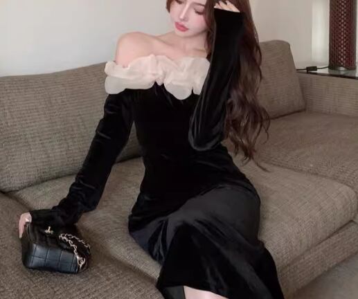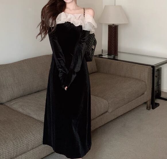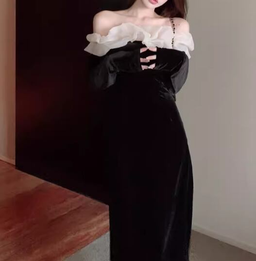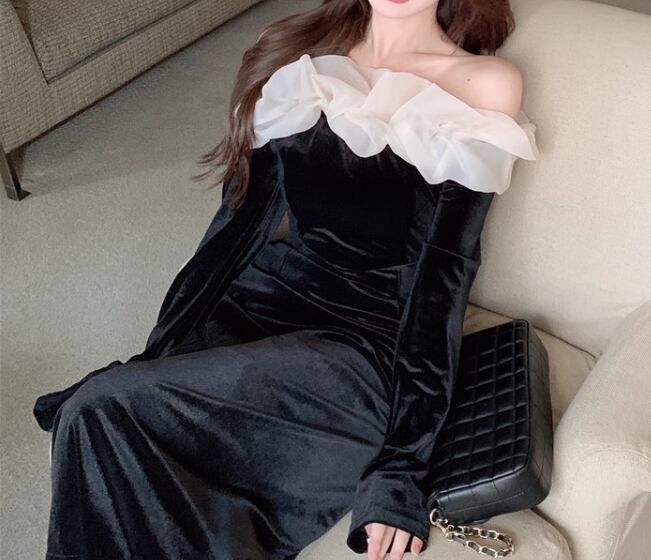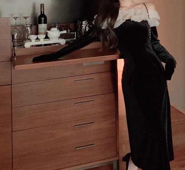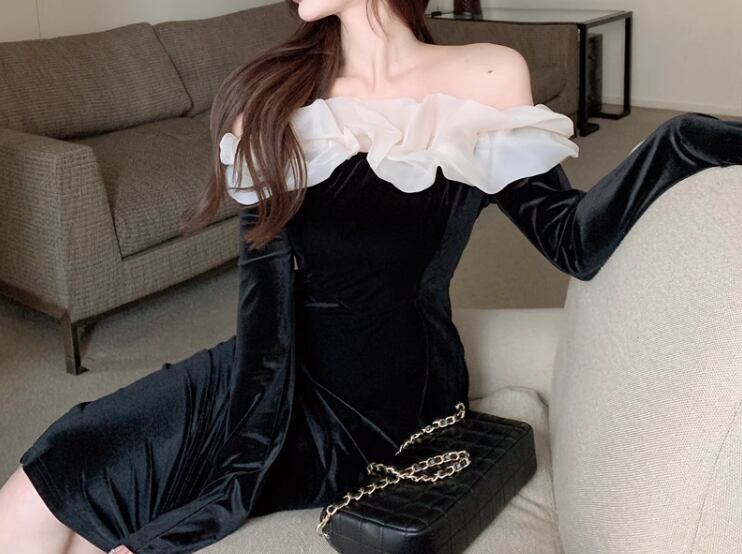 レディース ドレス パーティードレス ブラックドレス パーティー 膝下 ミモレ 長袖 オフショル タイト スリム ストレート 細身 レース フリル ドッキング プルオーバー ベルベット 可愛い きれいめ 大人可愛い 上品 おしゃれ かっこいい エレガント 抜け感 セクシー シック ラグジュアリー 高級感 無地 イベント ホテル レストラン デート 食事会 会食 クリスマス 高見え 冬 S M L ブラック