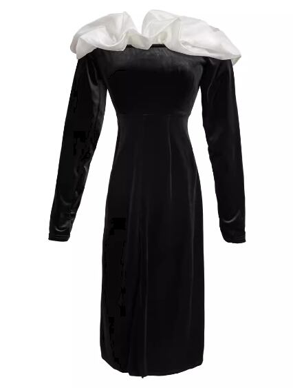 ブラック×ホワイトのシックな色使いとセクシーで大人っぽいデザインが魅力的な長袖のミモレ丈ドレス。