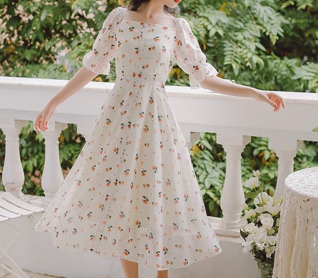 レディース ワンピース ミモレ ロング 半袖 ベルスリーブ スクエアネック Aライン フェミニン 刺繍 シフォン フリル ウエストマーク ハイウエスト 異国風 ボタン かわいい 大人可愛い きれいめ 上品 おしゃれ ガーリー エレガント キュート ラグジュアリー 清潔感 爽やか シック 高級感 優しい 穏やか フェアリー 花柄 フラワー プリント 夏 デート お出かけ 普段使い 清楚 S M L ホワイト