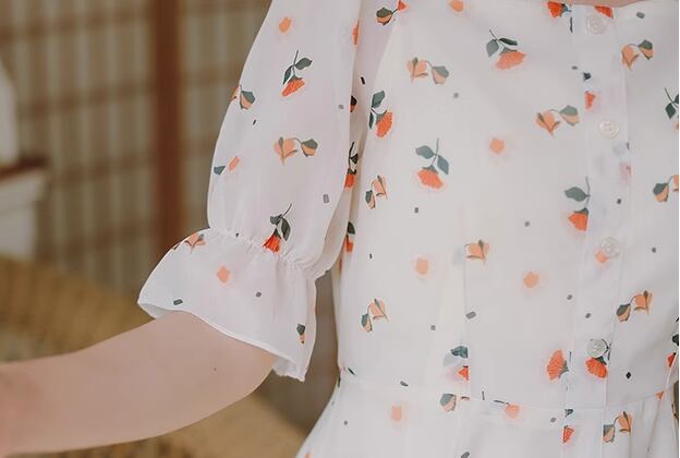 レトロな雰囲気の花柄模様が可愛い、半袖のミモレ丈ワンピース。