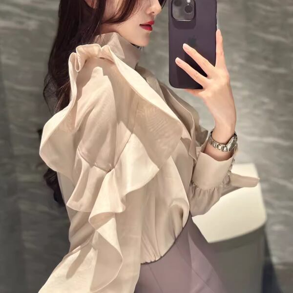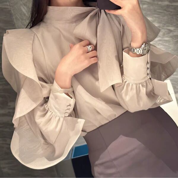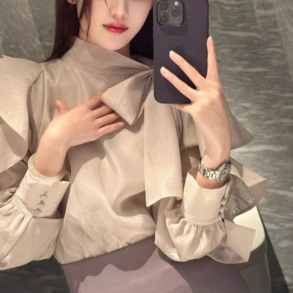 大きなリボンの蝶ネクタイと肩からのフリルが美しいフレンチスタイルのスリムシャツ。エレガントでスタイリッシュなデザインがで、フォーマルな場面にもカジュアルな装いにも対応します。ディテールにこだわった一枚で、個性的な着こなしが楽しめる一着です。