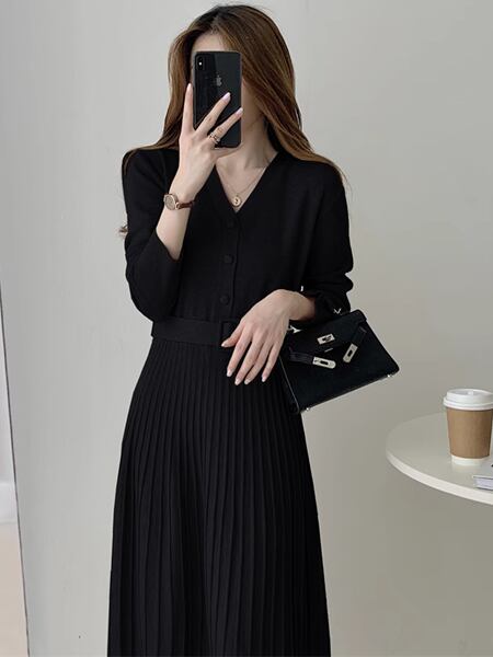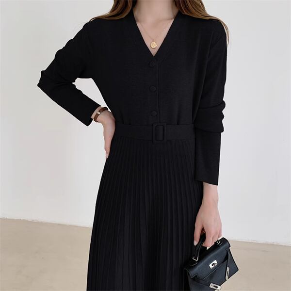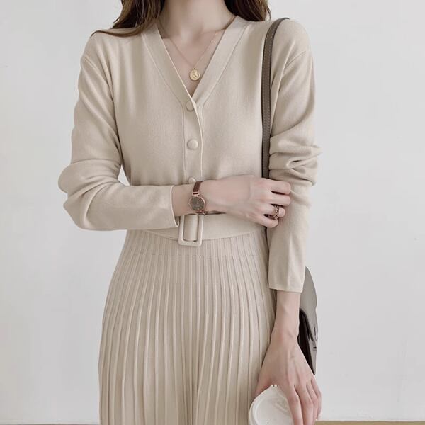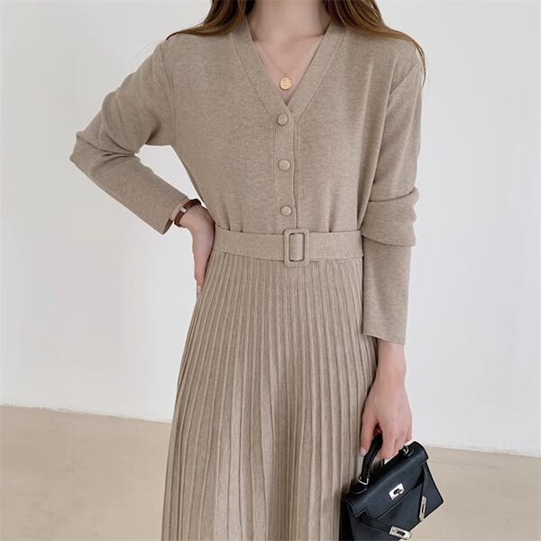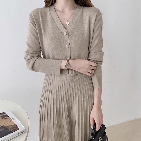 シングルブレストプリーツロングスカートのニットワンピースは、Vネックデザインでエレガントな印象を演出。柔らかいニット素材で快適な着心地を提供し、プリーツが動きに美しいシルエットを加えます。デイリーから特別な日まで幅広く活躍してくれる逸品です。