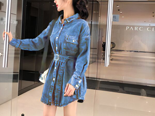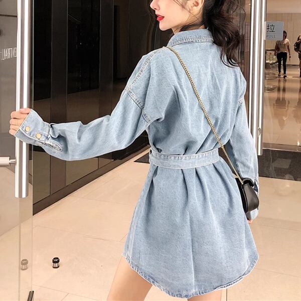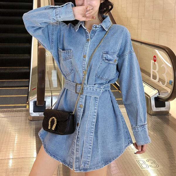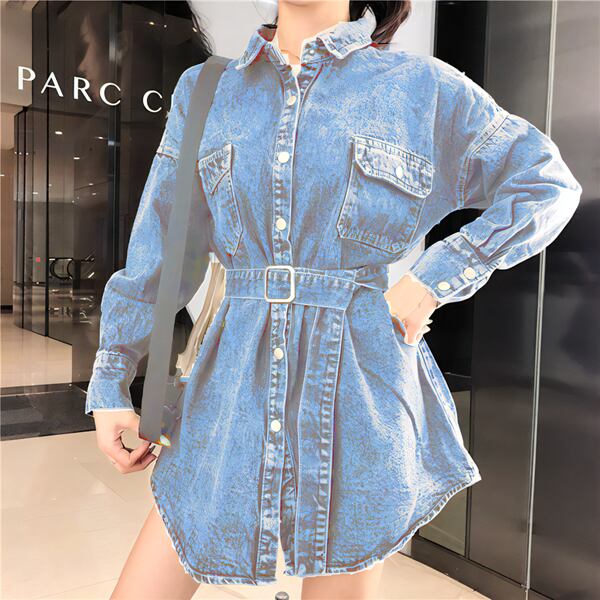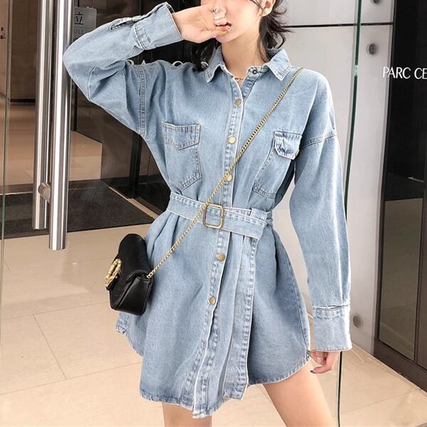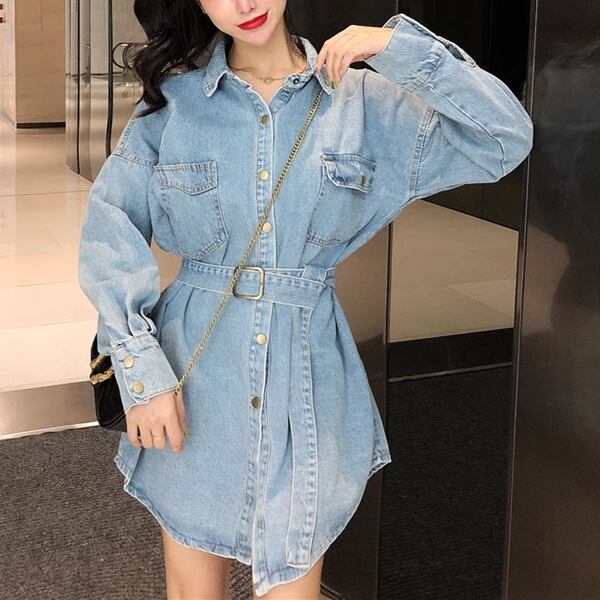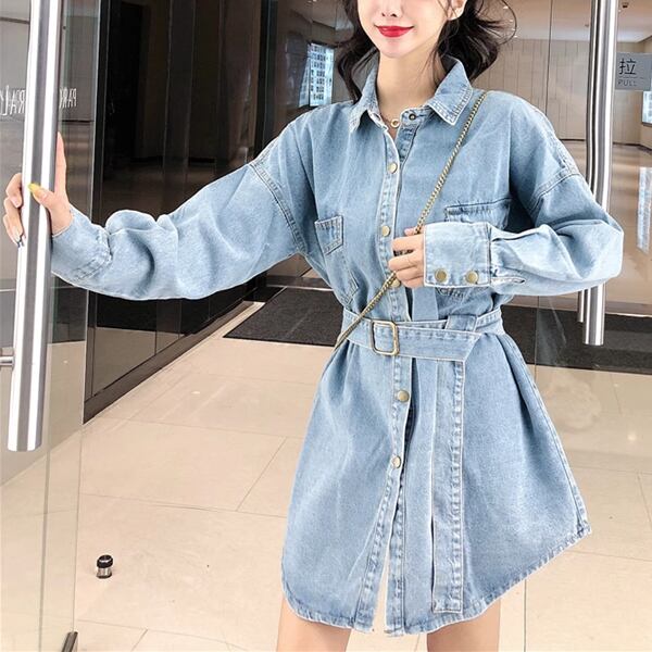 ミドル丈デニムシャツジャケット レディース トップス ジャケット アウター 上着 デニム デニムシャツ Gジャン 長袖 ポロカラー 細身 ストレート 裾ワイド ベルト ポケット ボタン デニム ブルーデニム 大人可愛い カジュアル かっこいい レトロ ラフ ガーリー ルーズ オフィスカジュアル 無地 春 秋 10代 20代 オフィス 通勤 アウトドア キャンプ イベント ガーデン ライブ コンパ カフェ ツーリング