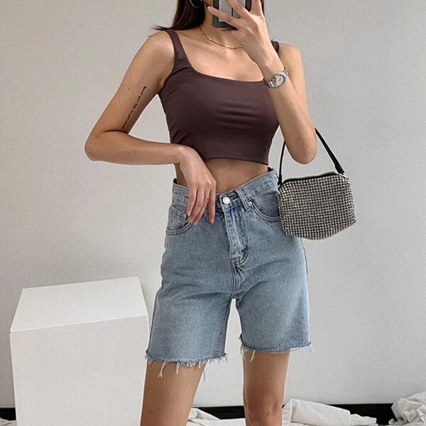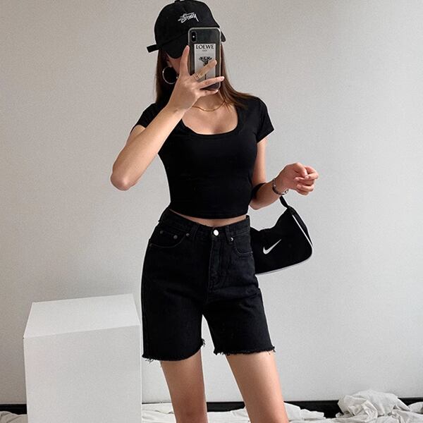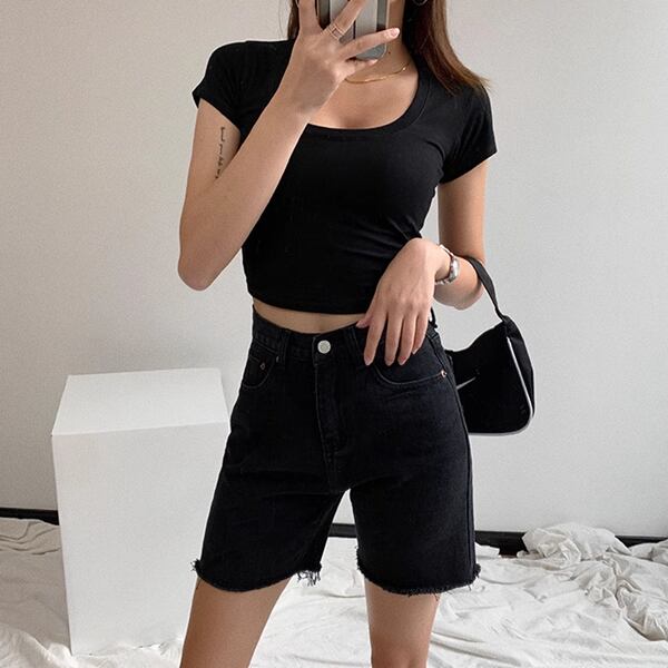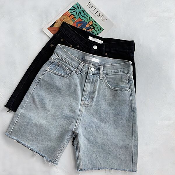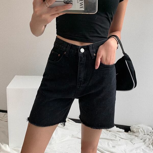 アメリカンなハイウエストでローエッジのデニムショートパンツ。スタイリッシュなデザインと快適な履き心地です。カジュアルなコーディネートに最適。夏の定番アイテムとして活躍します。2カラーございます。お選びください。