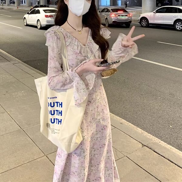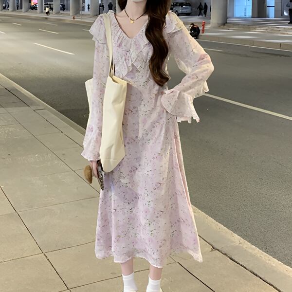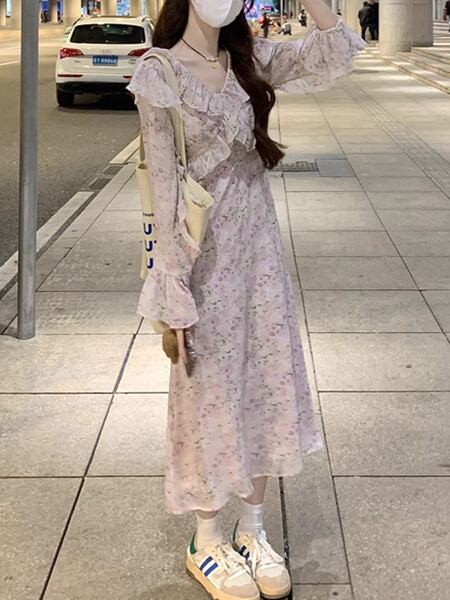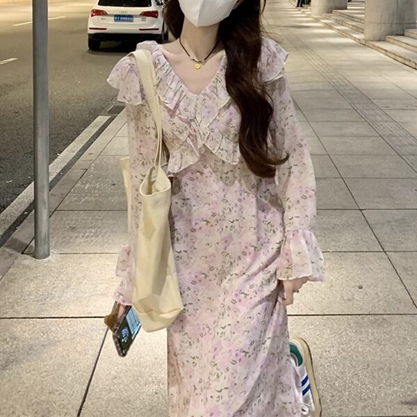 花柄でフレンチフリルが可愛いロングスカートの長袖ドレス。エレガントでフェミニンなデザインが魅力。軽やかなフリルと流れるようなシルエットが、華やかな雰囲気を演出します。特別な日にも日常使いにもぴったりな一着です。