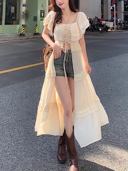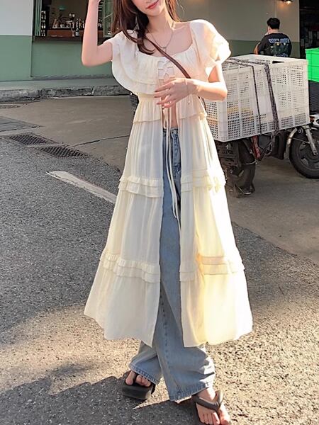 リゾートスタイル・フリルのスカートドレス レディース スカート トップス ワンピース ロング 半袖 プリンセススリーブ スクエアネック Aライン ミモレ丈スカート レースフリル きれいめ カジュアル おしゃれ ラフ ガーリー ルーズ 無地 プリンセス 20代 30代 通勤 通学 イベント ショッピング ライブ コーデ 日焼け止め 着回し 着瘦せ