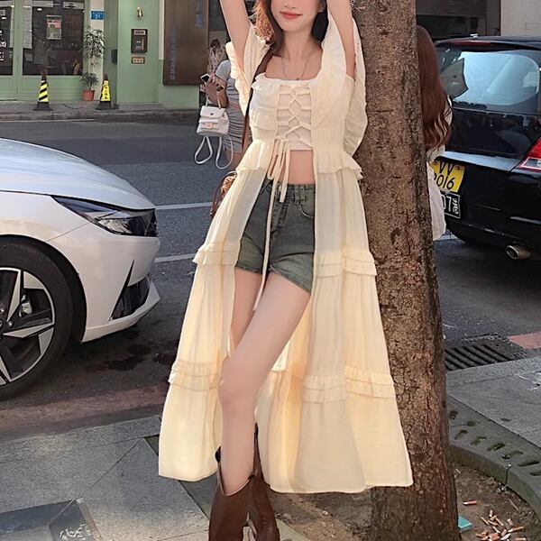フリルロングリゾートスタイルスカートドレスは、エレガントなフリルとストラップデザインが特徴のアイテムです。軽やかな素材で、リゾート地やカジュアルなシーンで活躍します。リラックスした雰囲気と女性らしさを演出する一着です。