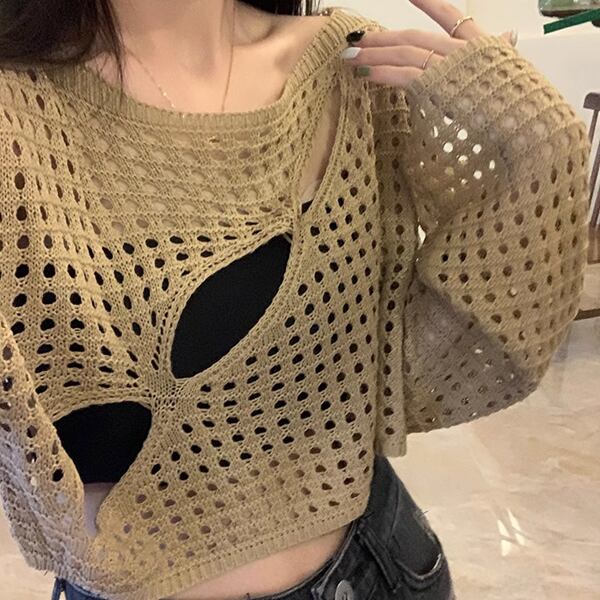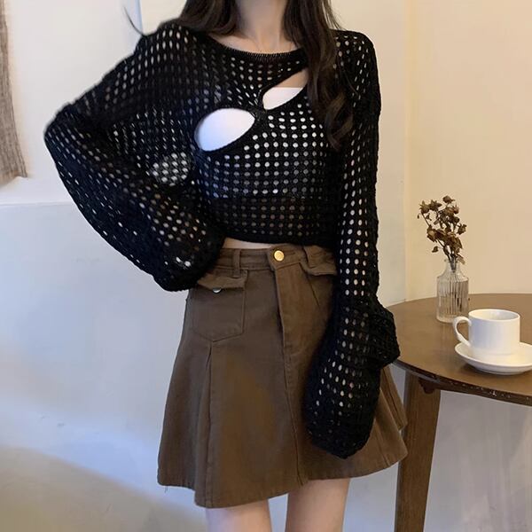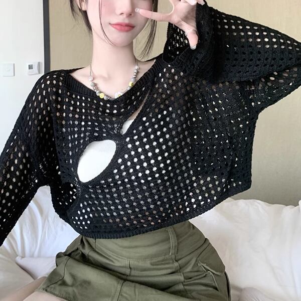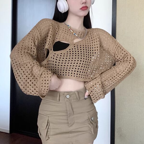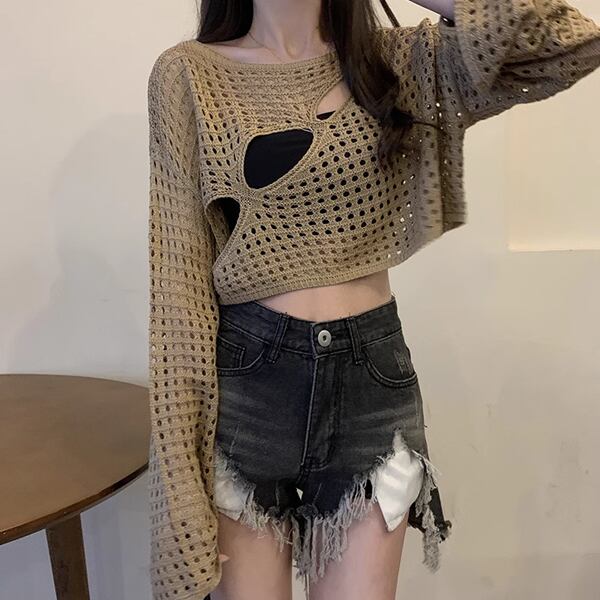 3色展開 穴あきデザインサスペンダーブラウス レディース トップス ロンT カットソー セーター プルオーバー サマーセーター ショート クロップド丈 長袖 萌袖 ラウンドネック ノーカラー スリム 細身 ストレート アシンメトリー ヘッジ ダメージ くり抜き 肌見せ へそ出し 通気性 凸凹 かわいい カジュアル おしゃれ かっこいい ラフ ルーズ 個性的 涼しげ 無地 エンボス 春 夏 秋 10代 20代 通勤 通学 アウトドア キャンプ ガーデン ライブ カフェ ツーリング インスタ映え 日焼け防止