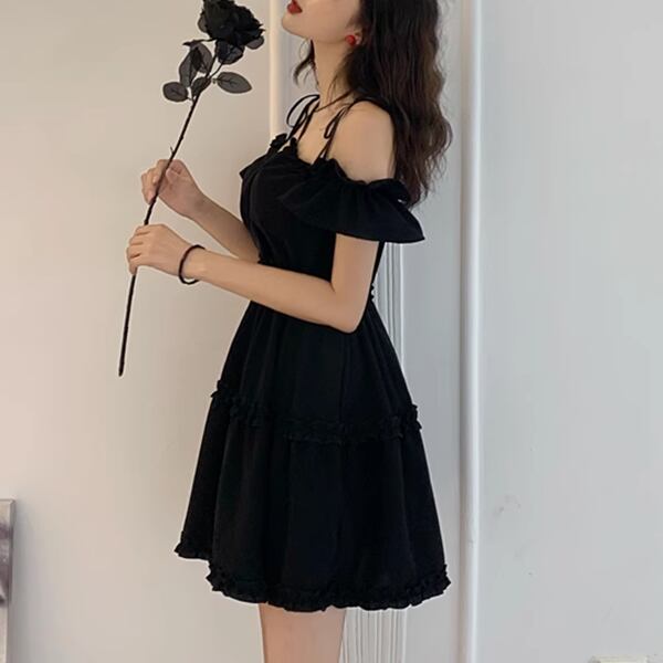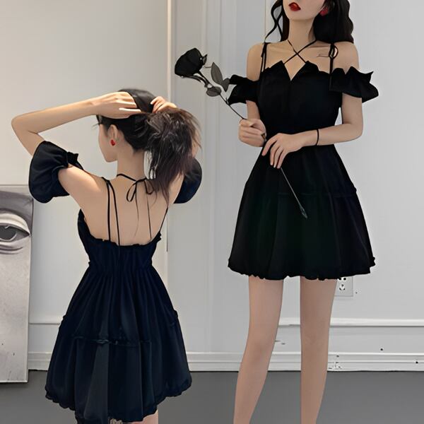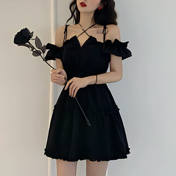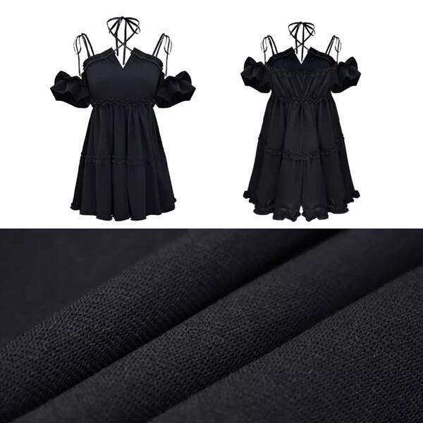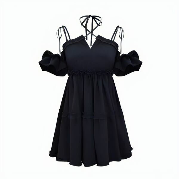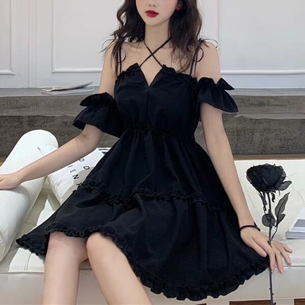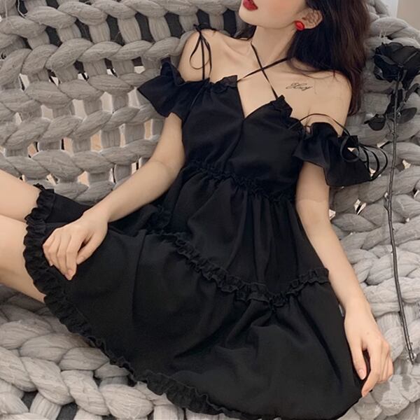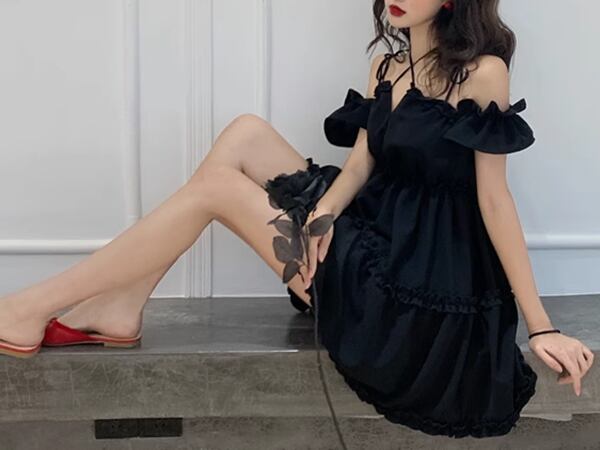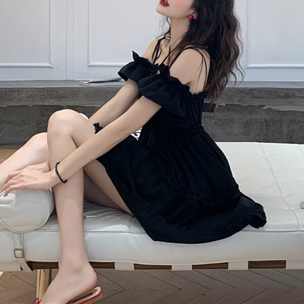 オフショルダーのサスペンダードレス。ホルターストラップがエレガントでセクシーなデザインの、魅力的なブラックスカートです。サスペンダーがスタイリッシュで、どんなシーンでも活躍します。夏のハイエンドファッショナブルな女性のために作られた魅せる一着です。