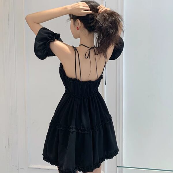 魅せるサスペンダードレス レディース スカート ワンピース ドレス パーティードレス ショートスカート フレアスカート ミニスカート ショート 膝上 半袖 蓮の葉スリーブ ハンギングネックスタイル フレア 細身 Aライン フェミニン フリル ハイウエスト ストラップ 大人可愛い 上品 おしゃれ ガーリー モード系 エレガント フォーマル キュート プリンセス ファンシー メルヘン 涼しげ 無地 春 夏 10代 20代 お出かけ パーティー イベント レストラン ホテル コンサート コンパ