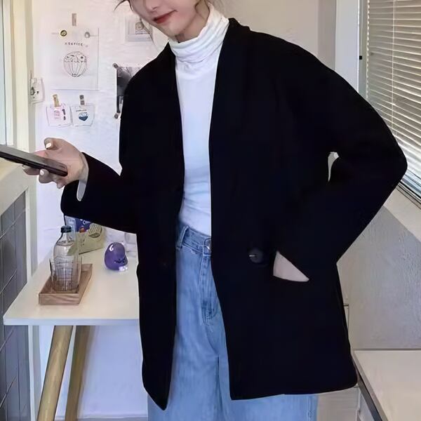 レトロスタイルの長袖ウールジャケットです。スリムなデザインとソリッドカラーが特徴。クラシックな雰囲気のカーディガンジャケットともいえる多用途なトップスです。洗練されたシルエットです。スタイリッシュに着こしてください。