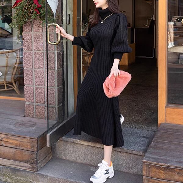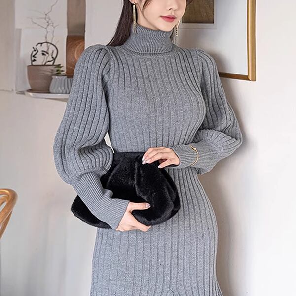 スリムなニット素材でフィッシュテールデザインが魅力のドレス、ロングセータースカートワンピです。ハイカラーとランタンスリーブがエレガントな印象を演出し、女性らしいシルエットを強調します。