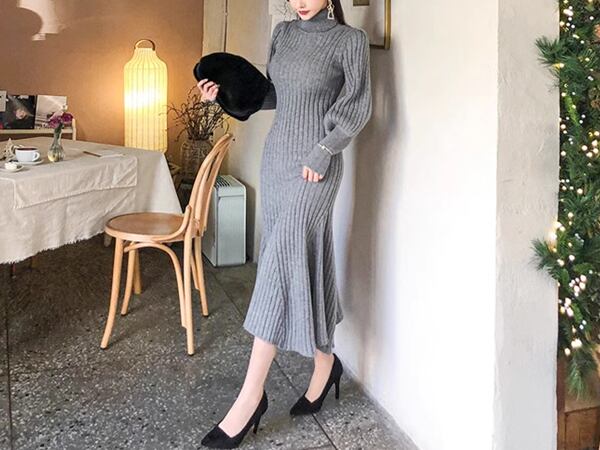 2カラー レディース ワンピース ニット ドレス ニットワンピ ニットスカート マーメイドスカート ロングスカート フリルスカート ミッドウエスト 膝下 ロング 長袖 ランタンスリーブ ハイネック タイト スリム 細身 マーメイド フェミニン ステッチ リブニット 伸縮性 上品 おしゃれ かっこいい ガーリー エレガント フォーマル セクシー シック スタイリッシュ 無地 20代 30代 パーティー レストラン ホテル コンサート コンパ