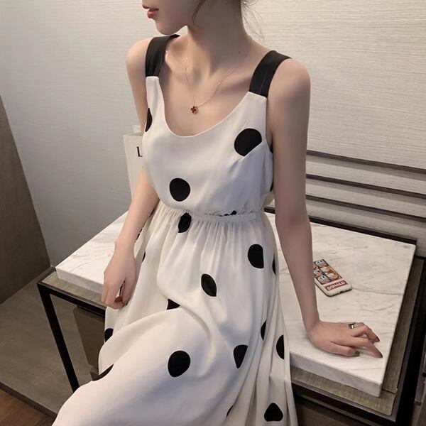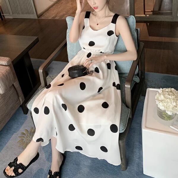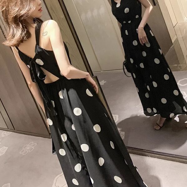 水玉模様のシフォンドレス。若見えと痩身効果が期待できる人気のアイテムです。バックレスデザインが女性らしいシルエットを引き立て、軽やかでエレガントなスタイルが魅力。特別なシーンやカジュアルな場面にもぴったりの一着です。