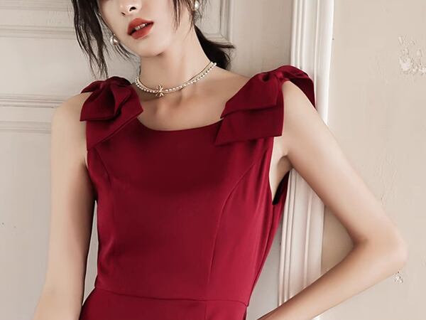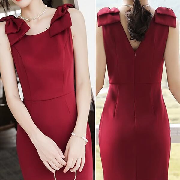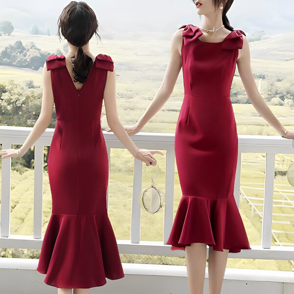 ミディアム丈のひざ下丈ワンピース。マーメイドシルエットのフィッシュテールデザインで、ブライダルのトーストドレスとしても最適。エレガントな赤いイブニングドレスは