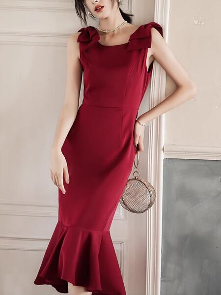 レディース ドレス ワンピース イブニングドレス パーティードレス ウェルカムドレス ウェディング 二次会 披露宴 演奏会 フォーマル 謝恩会 膝下 ミモレ 袖なし ノースリーブ Uネック マーメイド フィッシュテール ミッドウエスト ジッパー リボン 可愛い きれいめ 大人可愛い 上品 おしゃれ クール エレガント モダン エレガント フェミニン 無地 ホテル レストラン デート 食事会 ブライダル