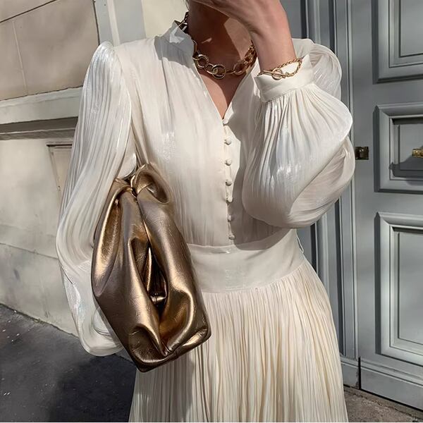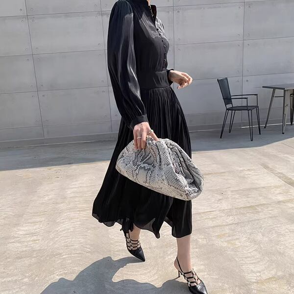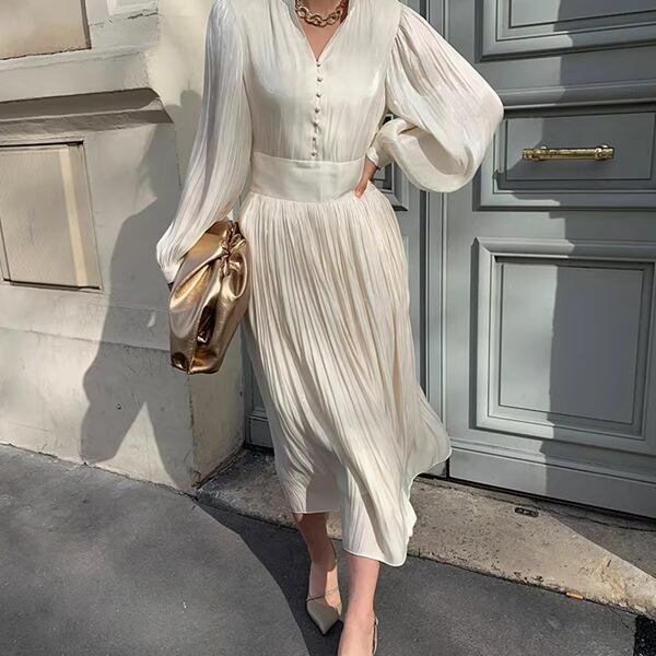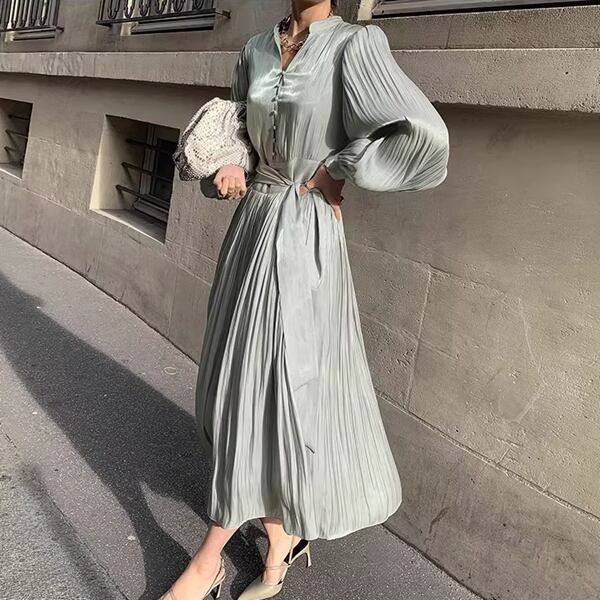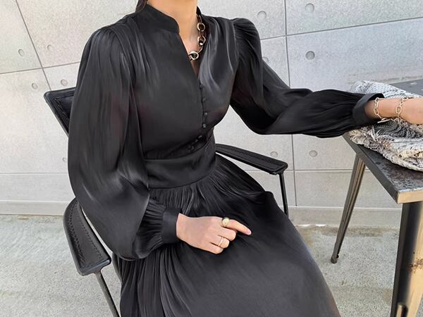 レースアップデザインが魅力的なスリムなハイウエストドレス。ランタンスリーブが華やかさを添え、ロングスカートがエレガントなシルエットを演出します。シンプルでありながら洗練されたスタイルを実現した一着です。