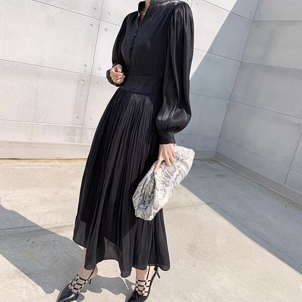 3色展開 レディース ワンピース ドレス ロングスカート ロング 長袖 ボリューム袖 ランタンスリーブ ハイネック セミフレア Aライン タックプリーツ サテン ウエストマーク ハイウエスト ウエストゴム デザインボタン ボタン ビジュー 大人可愛い 上品 おしゃれ モード系 エレガント 無地 20代 30代 ビジネス お出かけ パーティー イベント レストラン ホテル コンサート コンパ ゆったり フリーサイズ
