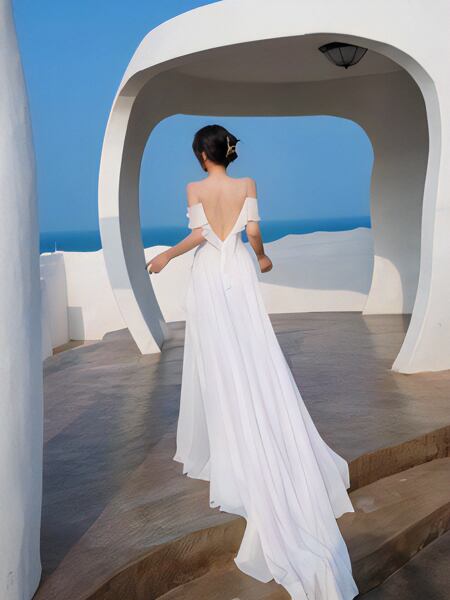 シーサイドバケーションに最適なロングテールビーチドレス。サスペンダースタイルで、リラックス感とエレガントさを兼ね備え、軽やかな素材とフローなシルエットが、ビーチでのひとときを華やかに演出します。