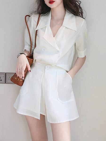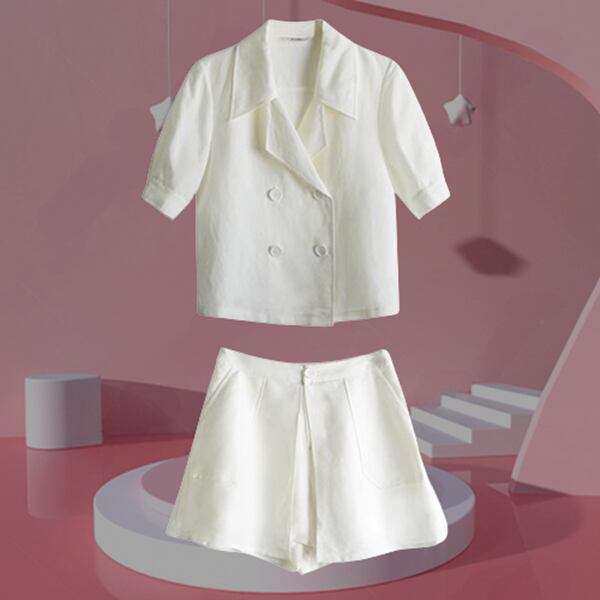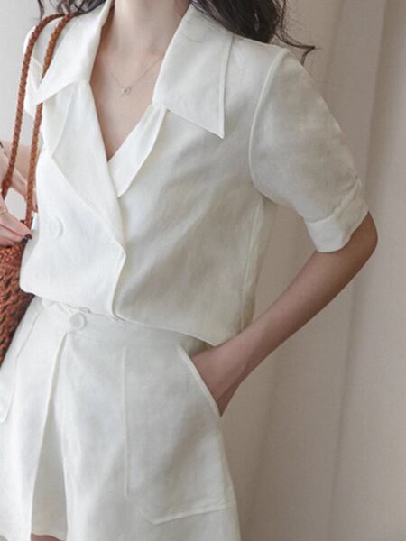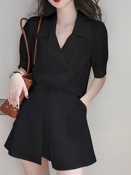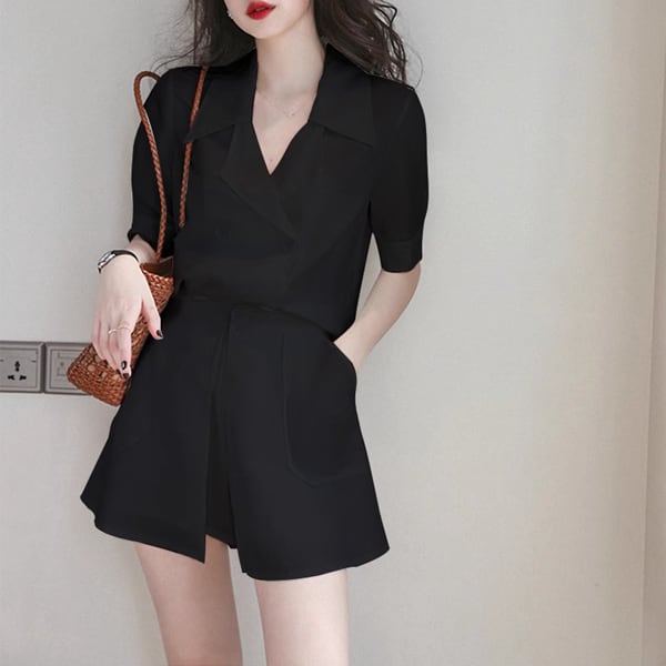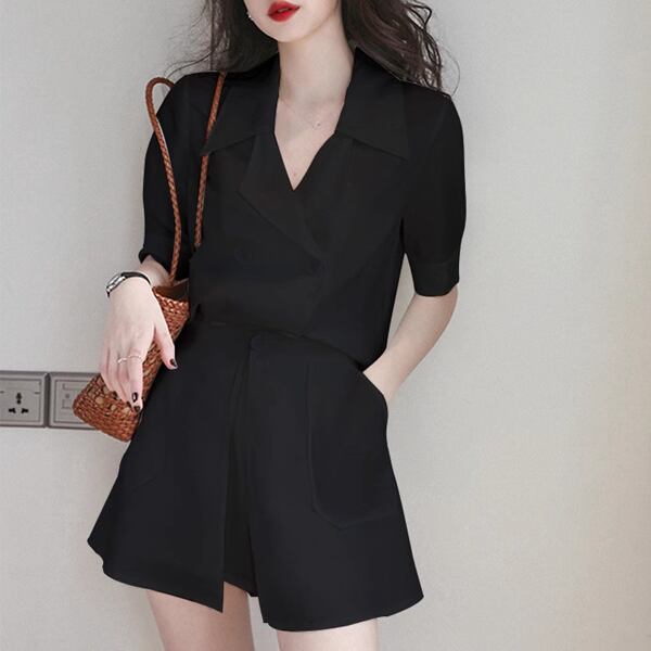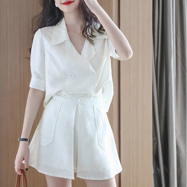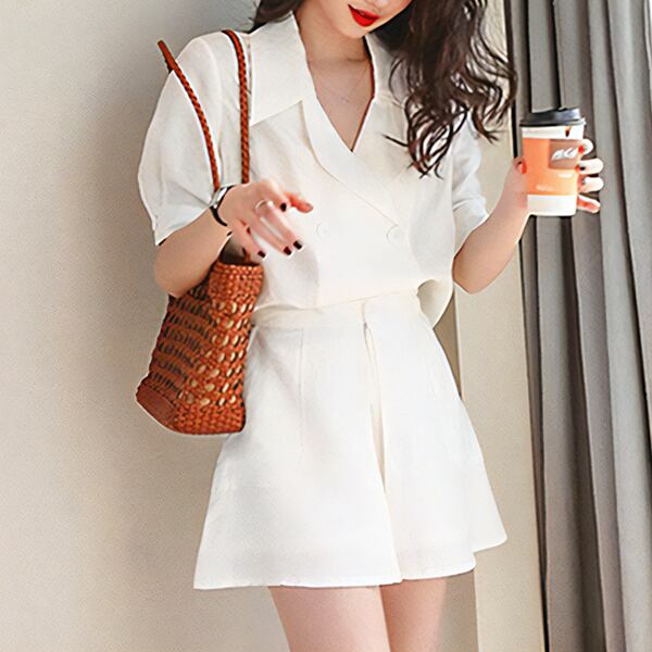 2カラー 上下2点 セットアップ ツーピーススーツ 二点セット スーツ風 レディース ジャケット パンツ ショートパンツ キュロットスカート ショート 半袖 パフスリーブ Vネック Aライン ポケット ボタン 大人可愛い カジュアル 上品 おしゃれ エレガント オフィスカジュアル 無地 春 夏 秋 10代 20代 通勤 お出かけ イベント レストラン ホテル ショッピング カフェ フェス 着回し