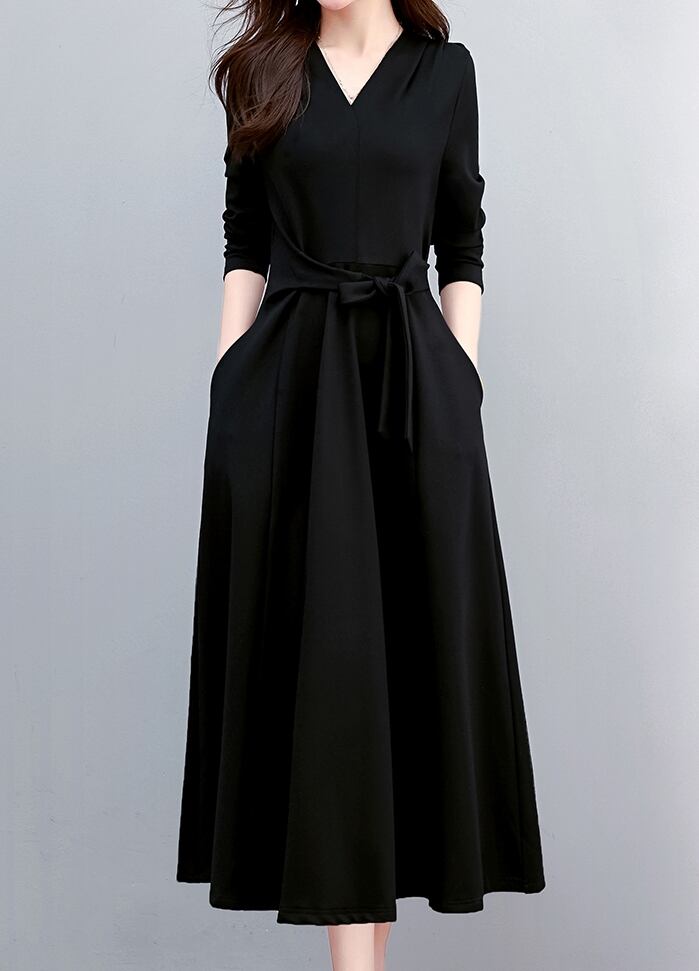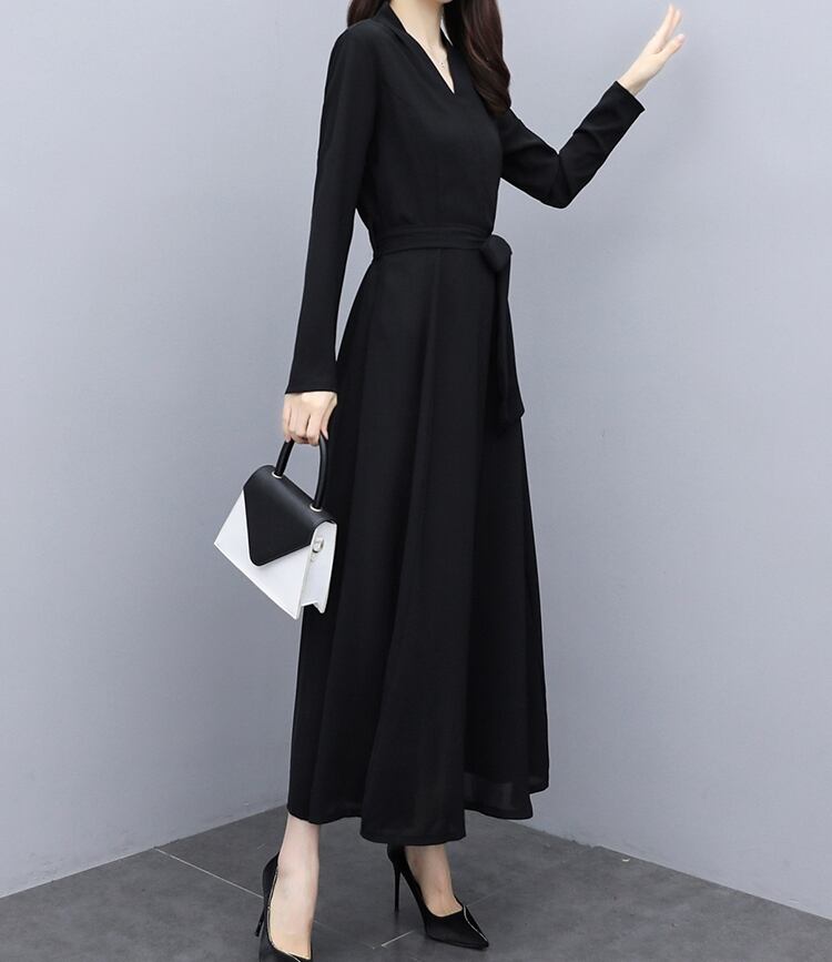 レディース ワンピース フォーマルドレス フレア ロング 長袖 Vネック Aライン シフォン リボン ウエストリボン サイドジップ ファスナー ハイウエスト 透け感 薄手 上品 クール エレガント フォーマル 無地 発表会 冠婚葬祭 オフィス ビジネス ホテル 発表会 モノトーン 清楚 4XL 5XL 大きいサイズ ブラック