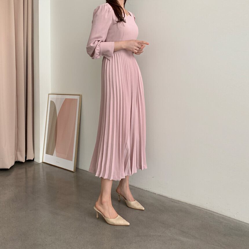レディース ワンピース 膝下 長袖 スクエアネック 襟なし Aライン 切り替え プリーツ タック シフォン バックリボン バックコンシャス ファスナー 大人可愛い おしゃれ エレガント 主役級 存在感 とろみ感 華やか 無地 春 秋 デート 女子会 合コン コンパ モテ 清楚 S M L XL ベージュ ピンク くすみカラー