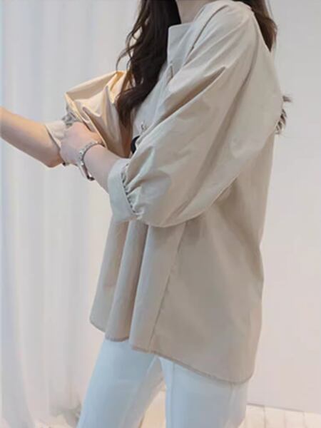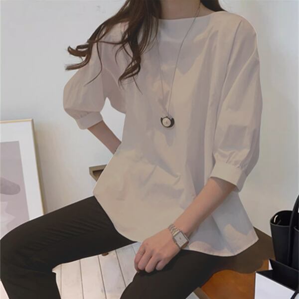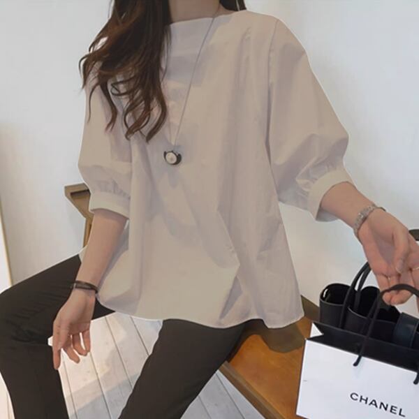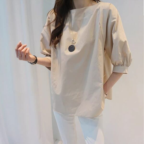 ゆったりデザイン ワンラインカラーパフスリーブ プルオーバーシャツ レディース トップス シャツ カットソー プルオーバー ミドル丈 長袖 パフスリーブ ラウンドネック 襟なし ノーカラー ワイド ストレート フェミニン ふっくら 綿 コットン かわいい 大人可愛い シンプル カジュアル 上品 おしゃれ ガーリー 個性的 エレガント オフィスカジュアル 涼しげ 無地 夏 10代 20代 通勤 通学 お出かけ イベント ガーデン ショッピング コンパ カフェ お腹カバー ゆったり
