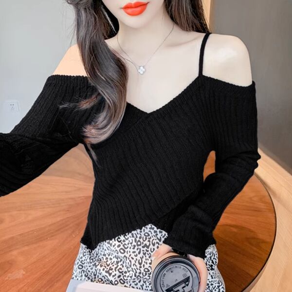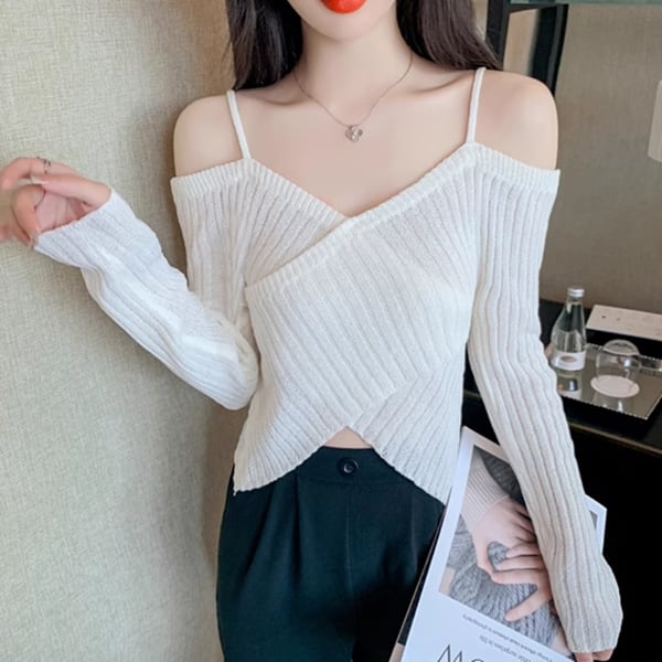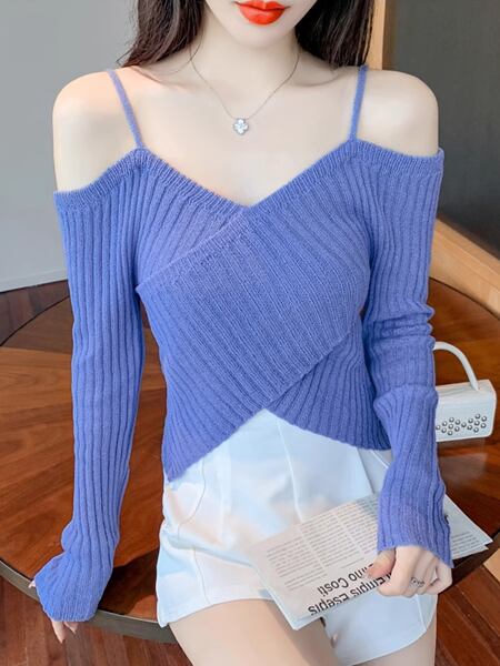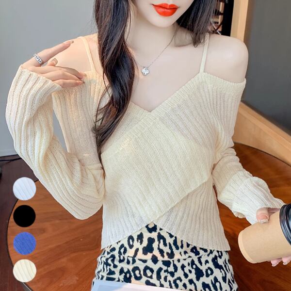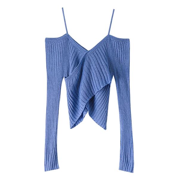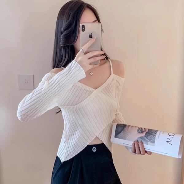 4色展開 レディース トップス ニット セーター ショート 長袖 萌袖 カシュクール ワンショルダー スリム 細身 ストレート サスペンダー アシンメトリー バックレス フェミニン フィット リブニット 伸縮性 かわいい 大人可愛い きれいめ 上品 おしゃれ クール モード系 エレガント フォーマル セクシー スリムフィット 高級感 無地 春 秋 20代 10代 お出かけ パーティー イベント レストラン ホテル コンパ カフェ