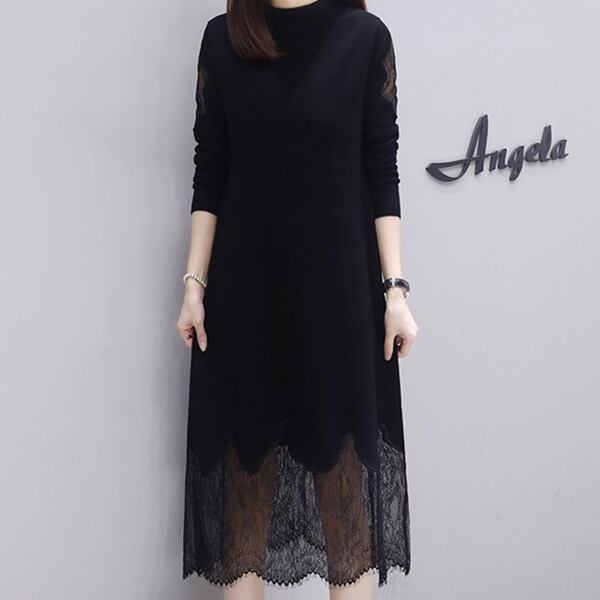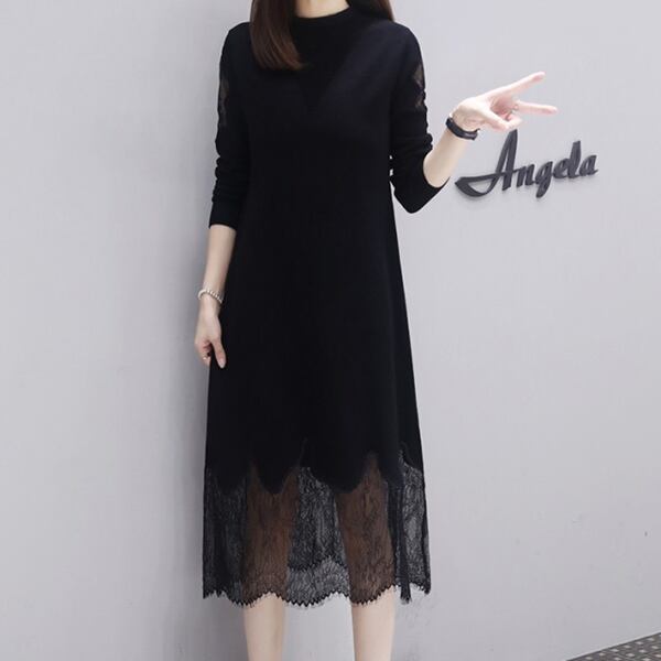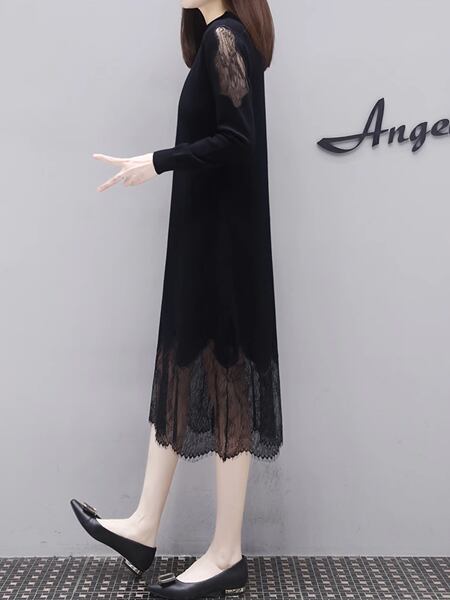 ドレス ワンピース イブニングドレス パーティードレス ブラックドレス ニットドレス パーティー フォーマル ロング 長袖 クルーネック フレア Aライン レース きれいめ 大人可愛い 上品 おしゃれ モード エレガント エレガント フェミニン ホテル レストラン 春 秋 20代 30代 イベント コンサート 体型カバー ゆったり ゆったりウエスト