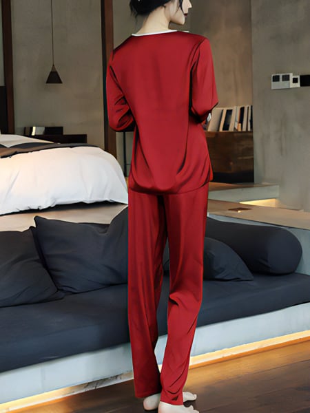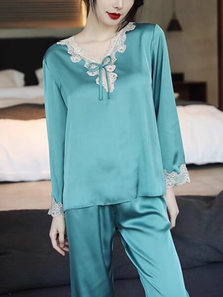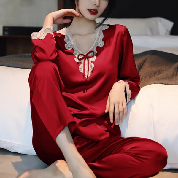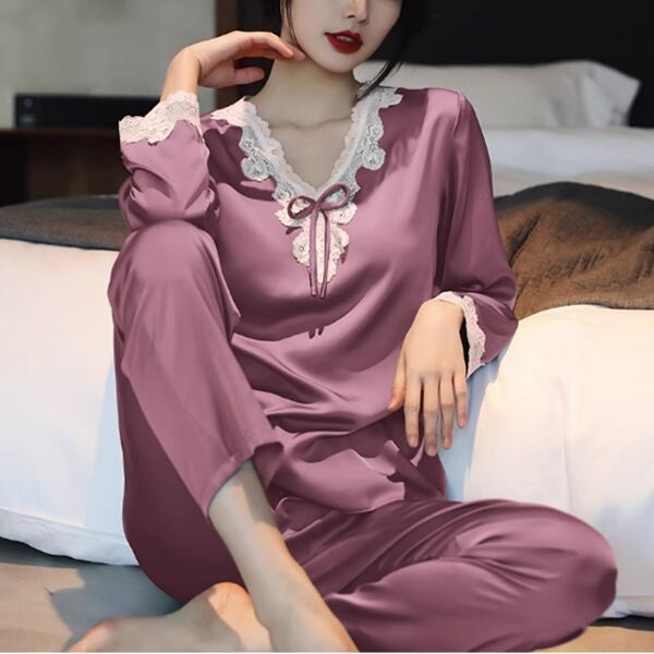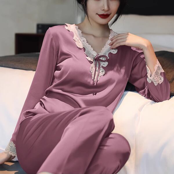 華やかなレースVネックが女性らしさを引き立てるツーピースパジャマスーツ。抜け感のあるストレートパンツと、長袖のトップスがセットで、ルームウェアやお泊まり旅行にもオススメ。女性らしさを引き立てるエレガントなデザインで機能性も兼ね備えた、お洒落心をくすぐるセットアップです。