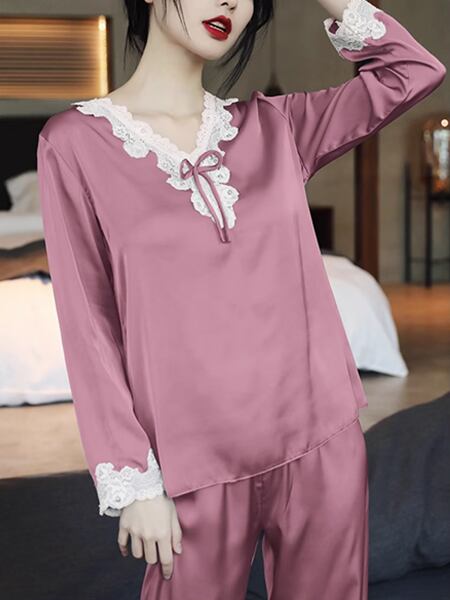 3色展開 パジャマスーツ上下セット ツーピース レディース トップス パンツ ボトムス ルームウェア パジャマ 部屋着 セットアップ ストレートパンツ 長袖 Vネック ノーカラー りぼんタイ スリム 細身 Aライン フェミニン レース かわいい カジュアル 上品 おしゃれ ガーリー キュート 爽やか 無地 10代 20代 お泊まり 旅行 バカンス ホテル 室内 動きやすい フィット