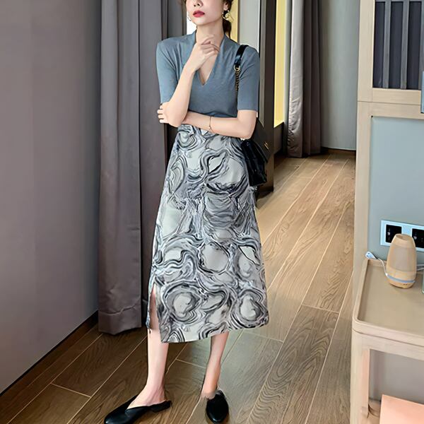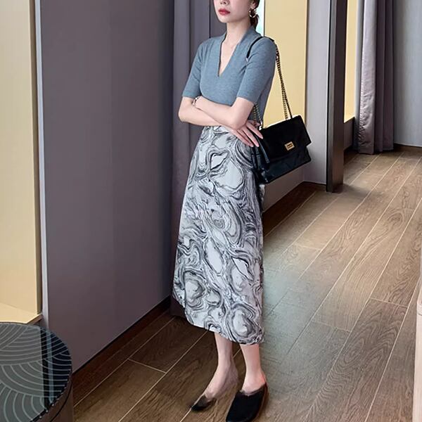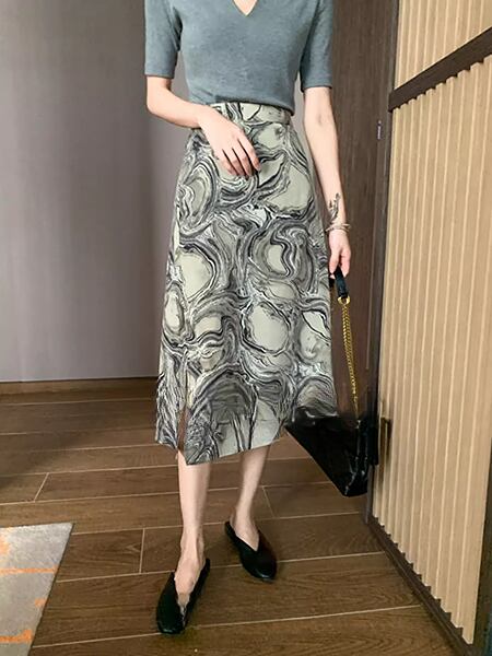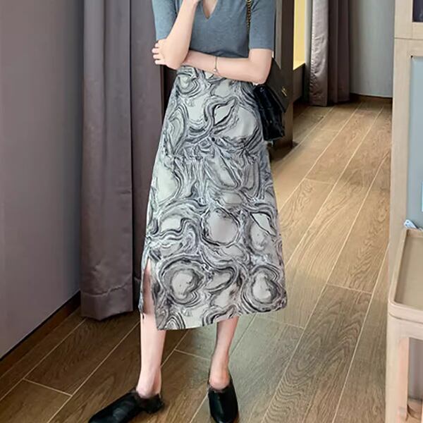 ヴィンテージ感漂うプリントが魅力のAラインスカート。ウエストの高さとスリムなシルエットが女性のヒップラインを美しく包み込みます。ミドル丈なので、大人っぽい着こなしにもぴったり。スリットが入っているので歩くたびに軽やかな動きを演出します。