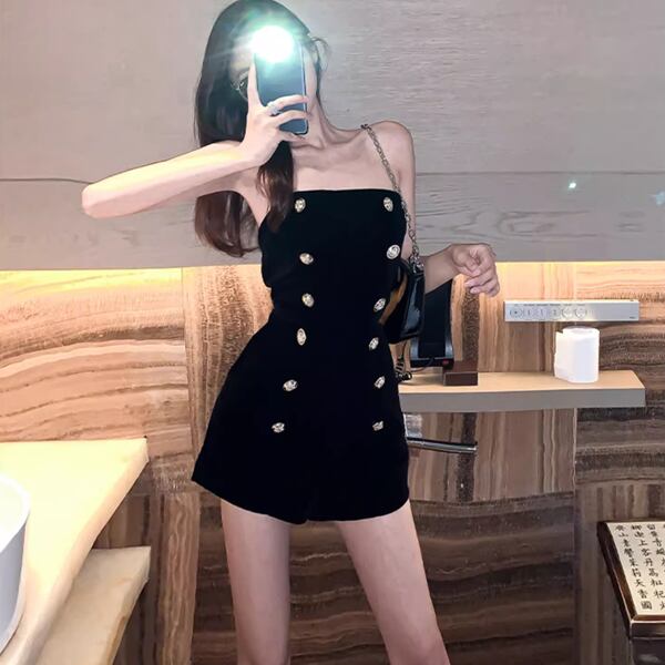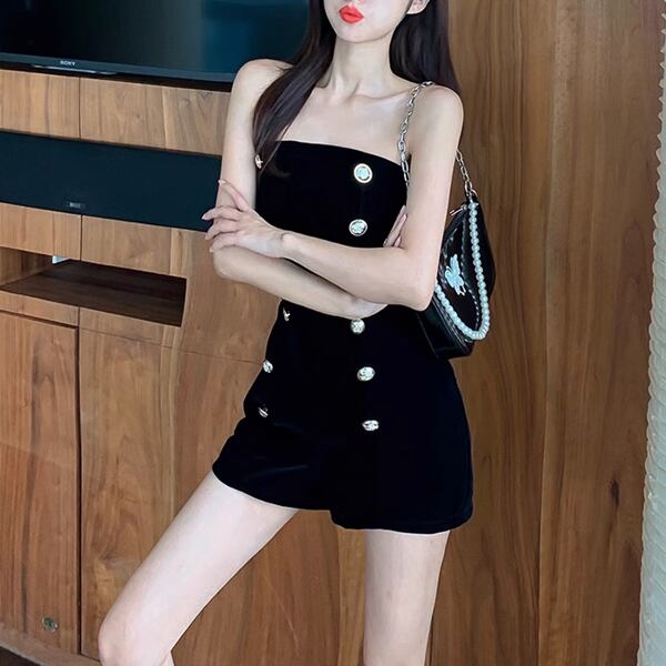 ヨーロッパスタイルが詰まった夏の新作ジャンプスーツ。ハイウエストデザインで脚長効果バツグン、さらに痩身効果も期待できる一着です。夏のパーティーやイベントにぴったり。黒のワイドレッグショーツで身を包み、特別な場面で自分を女神に変えて輝きを放ちましょう。