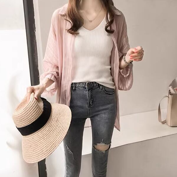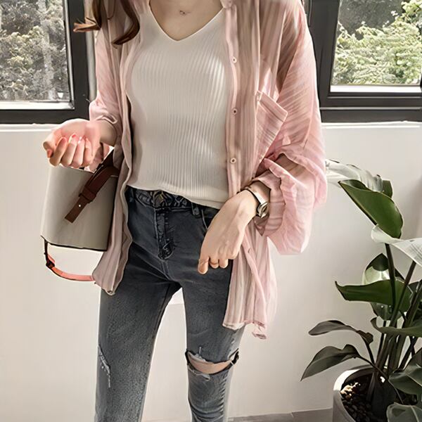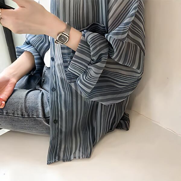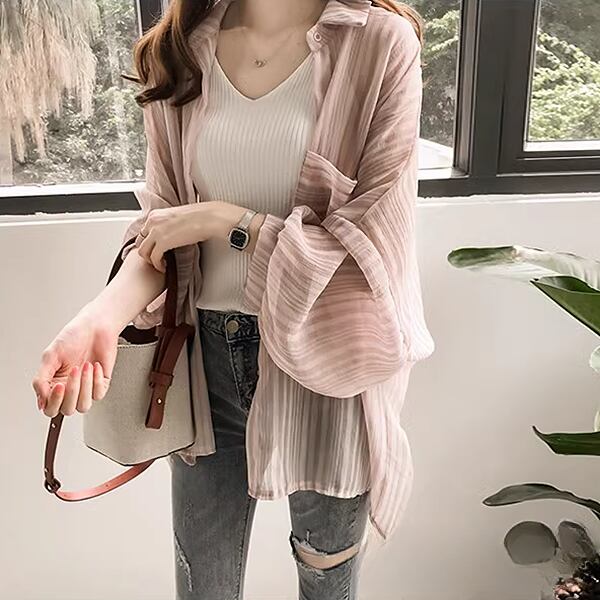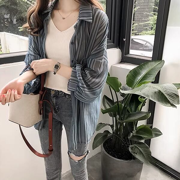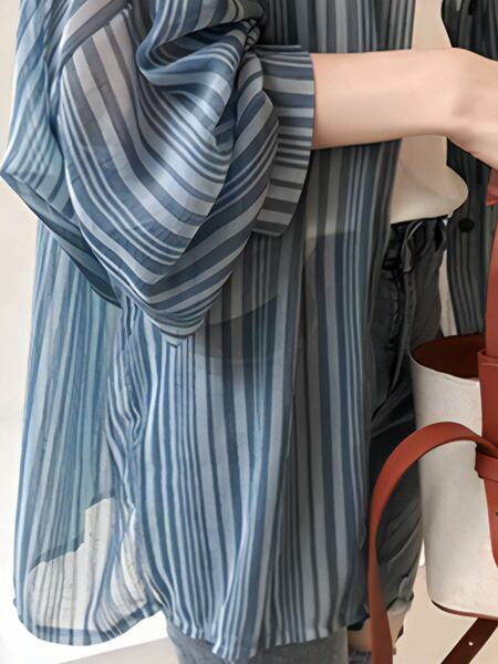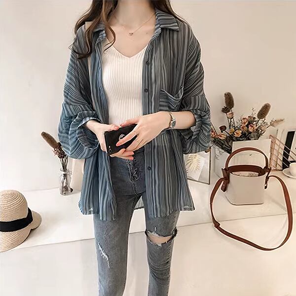 夏の新しい韓国スタイル。長袖ランタンスリーブストライプシャツ!シフォンカーディガン風の軽やかな印象で、女性らしさを引き立てる一枚です。シャツとしてはもちろん、ジャケットとしても活躍する優れもの。柔らかなシフォン素材とランタンスリーブの風合いが、程よい女性らしさを演出します。