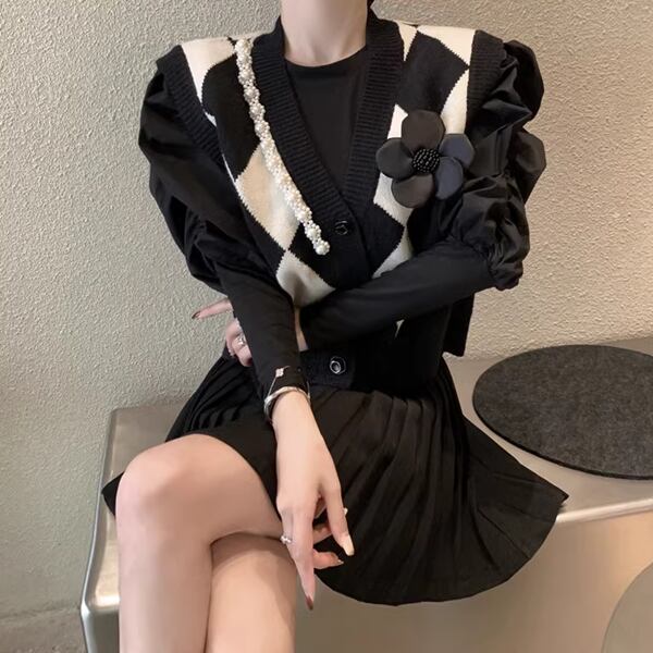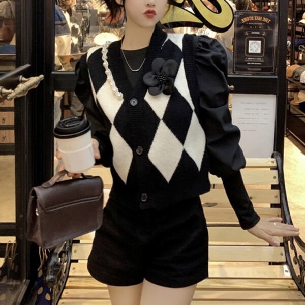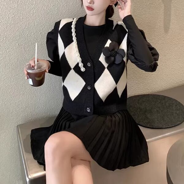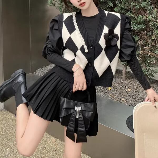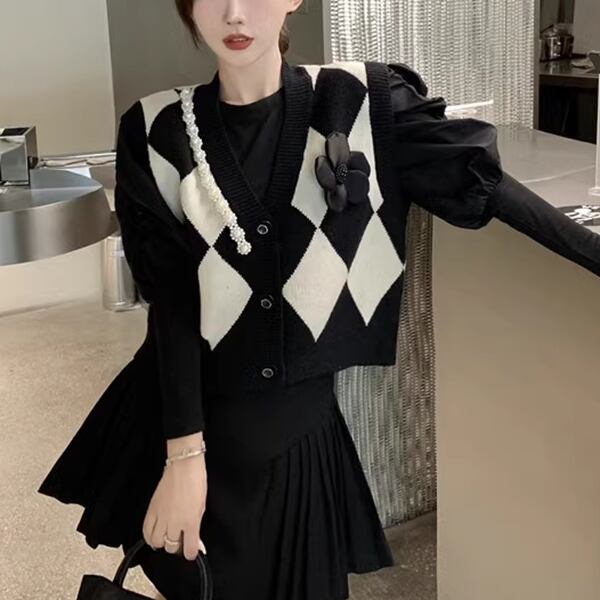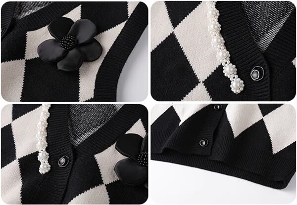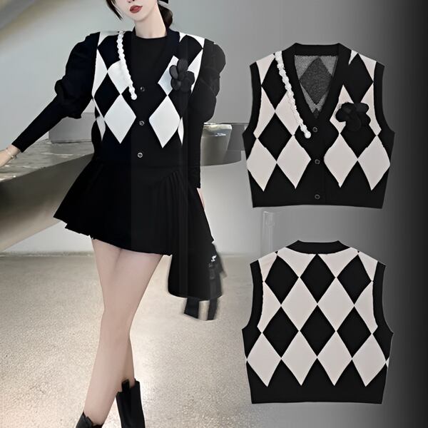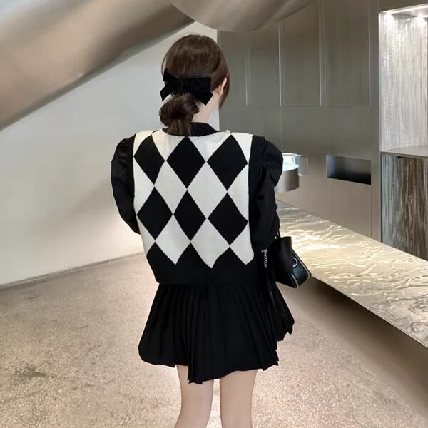 スタイリッシュな黒のニットベスト レディース トップス ニット ベスト アウター ジレ 袖なし ノースリーブ Vネック スリム 細身 ストレート ボタン ビジュー 伸縮性 バイカラー リブニット 大人可愛い シンプル カジュアル 上品 おしゃれ ガーリー フォーマル 知的 オフィスカジュアル 立体装飾 アーガイル 菱形 秋 冬 10代 20代 オフィス 通勤 イベント ショッピング ライブ 普段使い 着回し