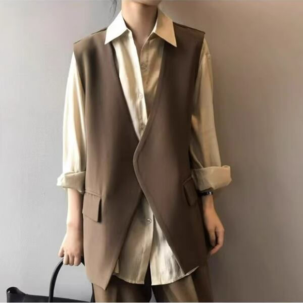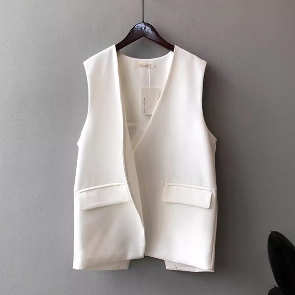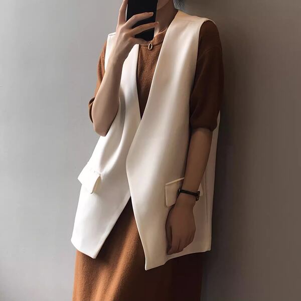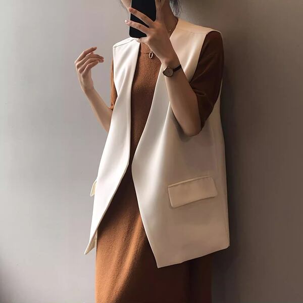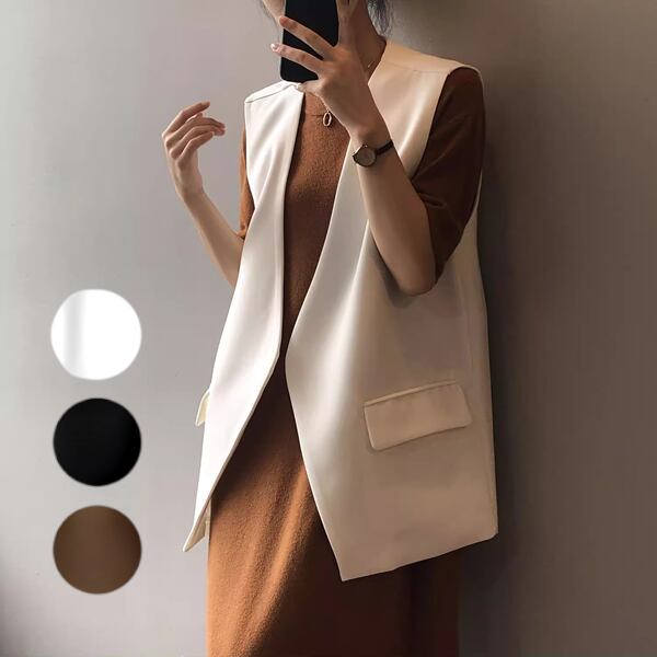 3色展開 後ろスリット入りベスト レディース トップス ジャケット ベスト アウター 上着 ジレ ロング 丈長 袖なし ノースリーブ 襟なし ノーカラー 細身 ストレート アシンメトリー スリット バックコンシャス ポケット シンプル 上品 おしゃれ ガーリー クール エレガント モダン 知的 爽やか 無地 プレゼン 20代 30代 オフィス 通勤 イベント カフェ