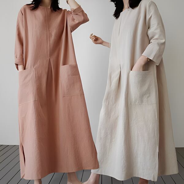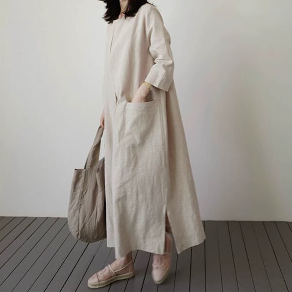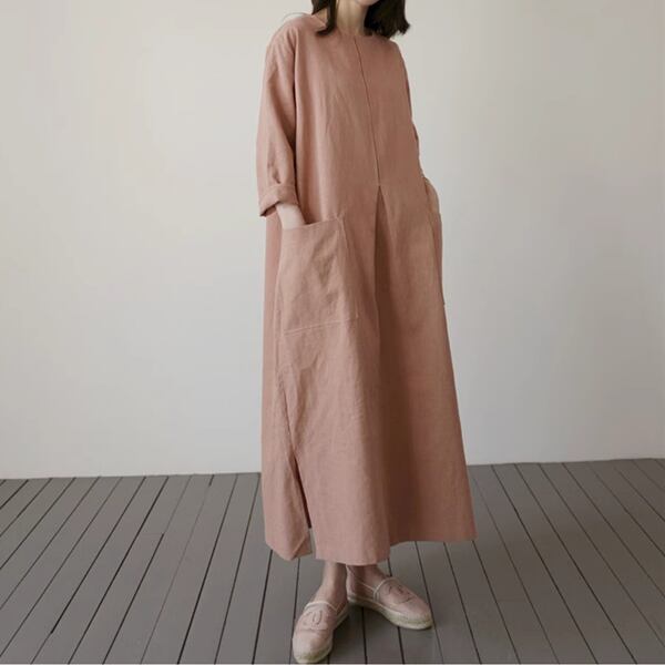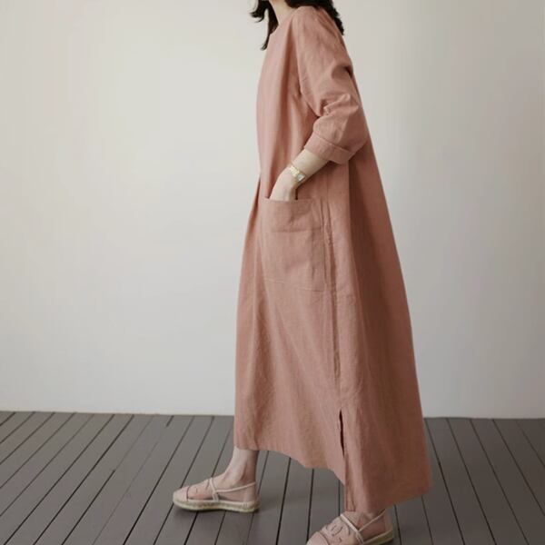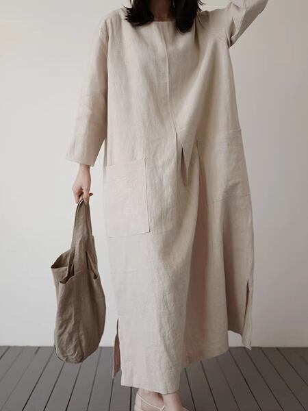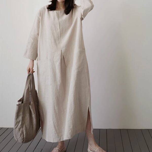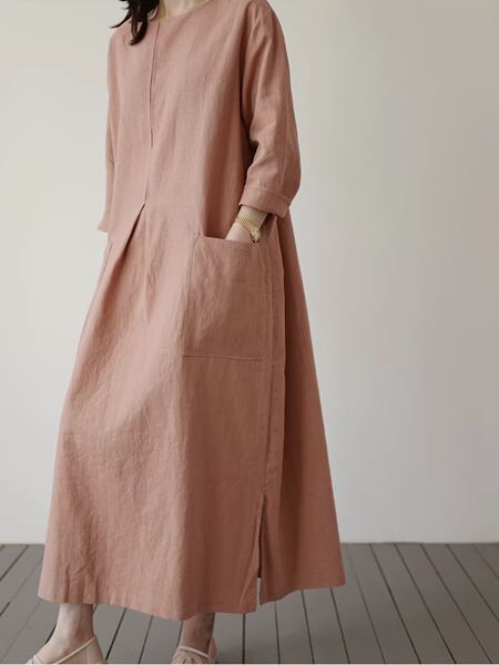 2カラー 綿とリネンのドレス レディース ワンピース ドレス アウター フレアスカート ロングスカート 7分袖 ラウンドネック ワイド フレア Aライン スリット サイドスリット ポケット リネン 綿 コットン 麻 大人可愛い シンプル カジュアル 上品 レトロ ルーズ 存在感 抜け感 爽やか 涼しげ 無地 春 夏 秋 10代 20代 30代 通勤 イベント 女子会 ガーデン ショッピング 動きやすい お腹カバー