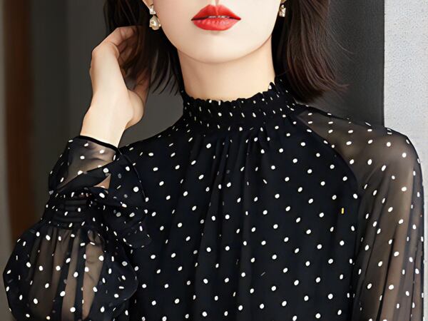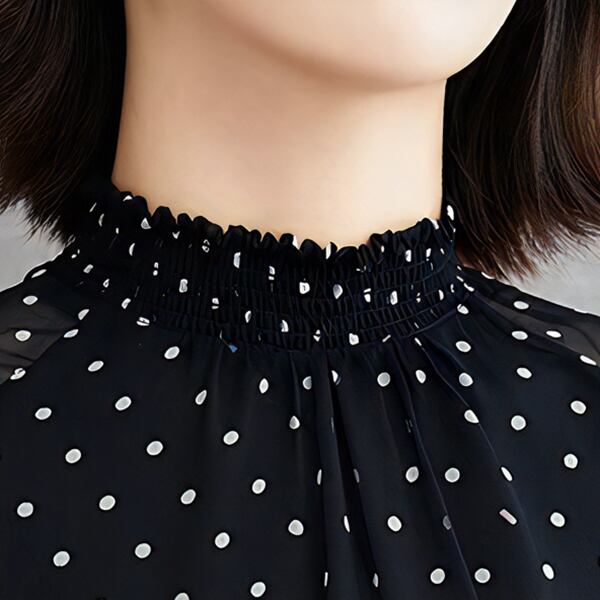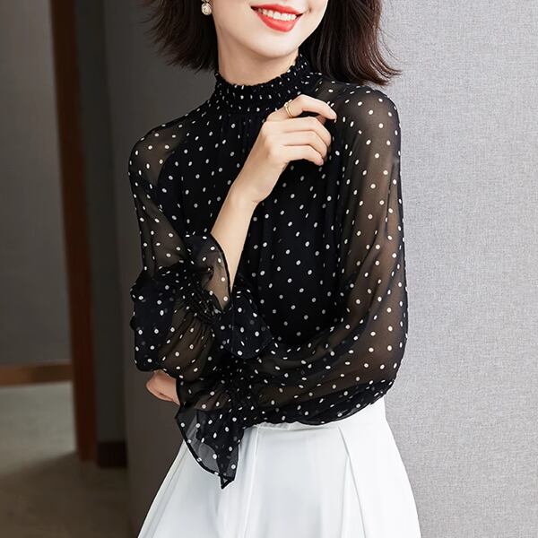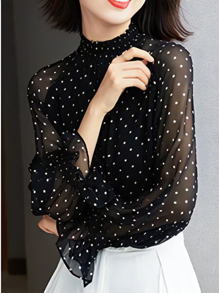 清楚な女性を演出する水玉シフォンシャツ。上品なフリルデザインとベルスリーブが、エレガント。春秋シーズンにマッチする、ヨーロッパ風のデザインで、洗練されたスタイルです。フレンチプリントの水玉模様は、着るだけで気分が華やぐこと間違いなし。上品なスタイリングを楽しみたい方にぴったりの逸品です。