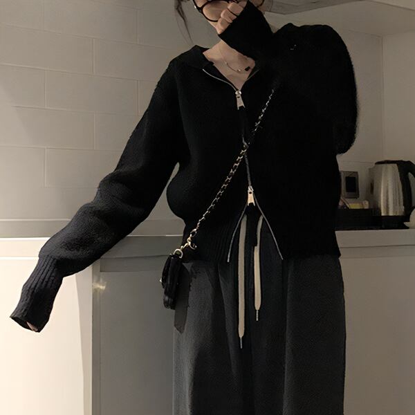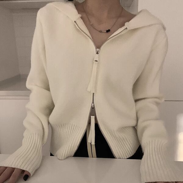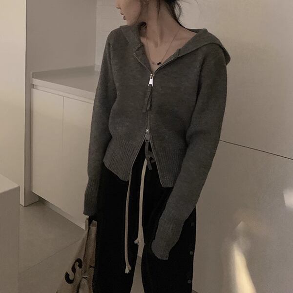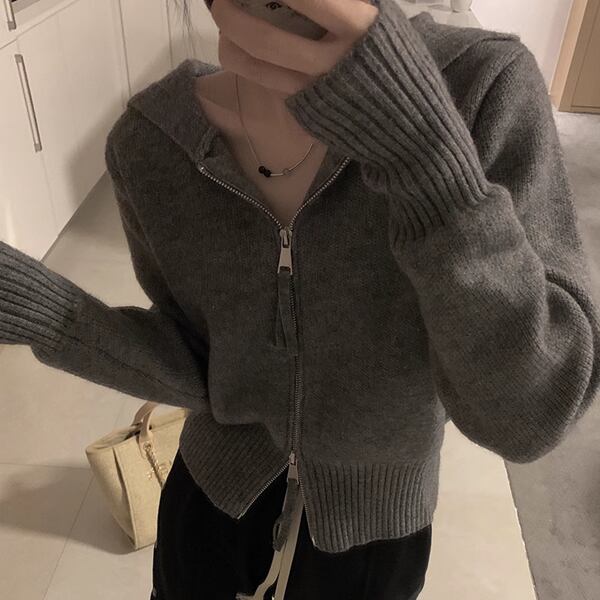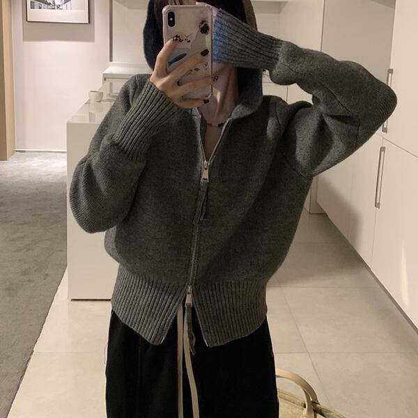 新デザインのニットカーディガン。スリムなシルエットにダブルジッパーとフードが付いているのが特徴。暖かい素材とスタイリッシュなデザインで、秋から冬にかけて重宝するショート丈のセータージャケット。シンプルながらもタイムレスなデザインで、長く愛用できる一着です。