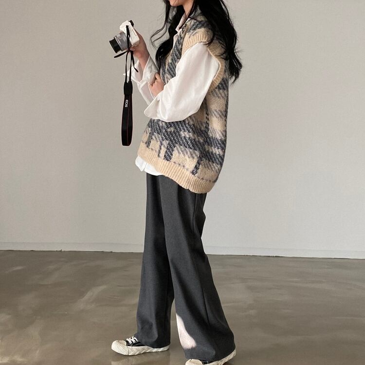 レディース ニット プルオーバー ベスト ミドル丈 ノースリーブ Vネック 襟なし セーラー風 配色 ニット かわいい カジュアル こなれ感 ラフ ガーリー 存在感 カレッジ風 学生風 チェック 秋 10代 20代 学生 お出かけ 重ね着 暖かい 普段使い 定番 ゆったり ゆる フリーサイズ ブラック ベージュ