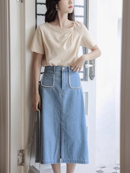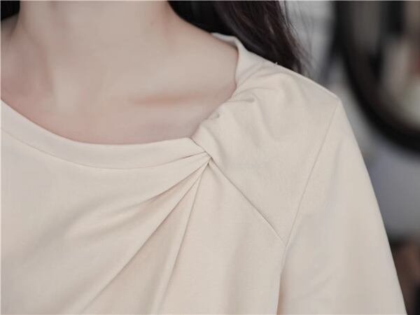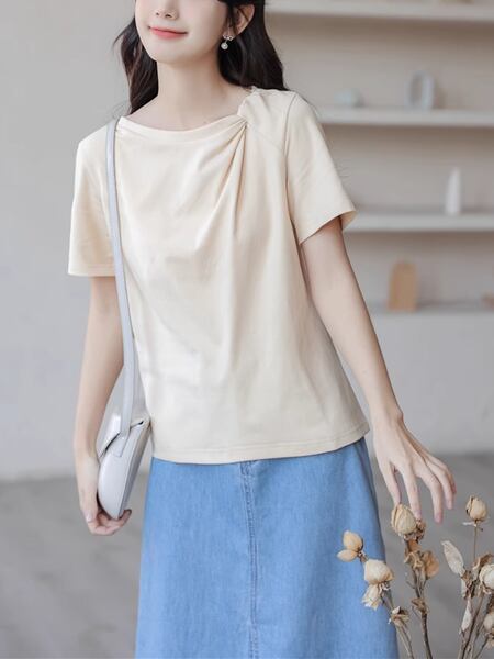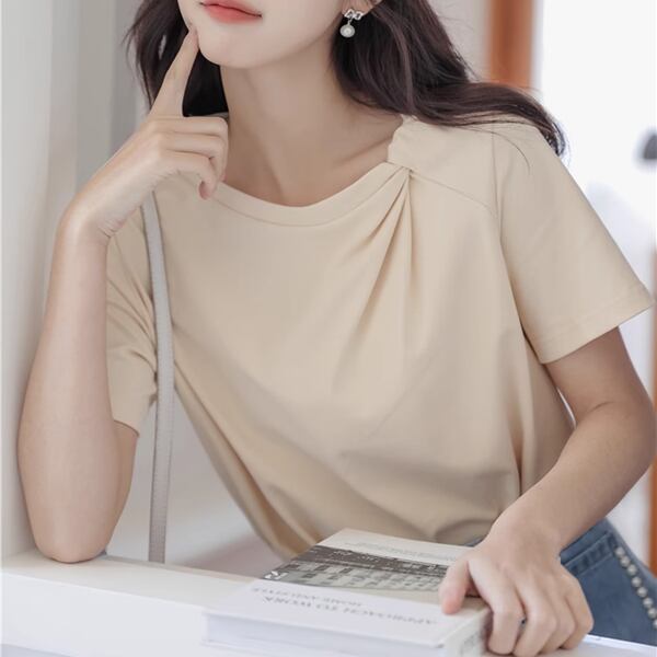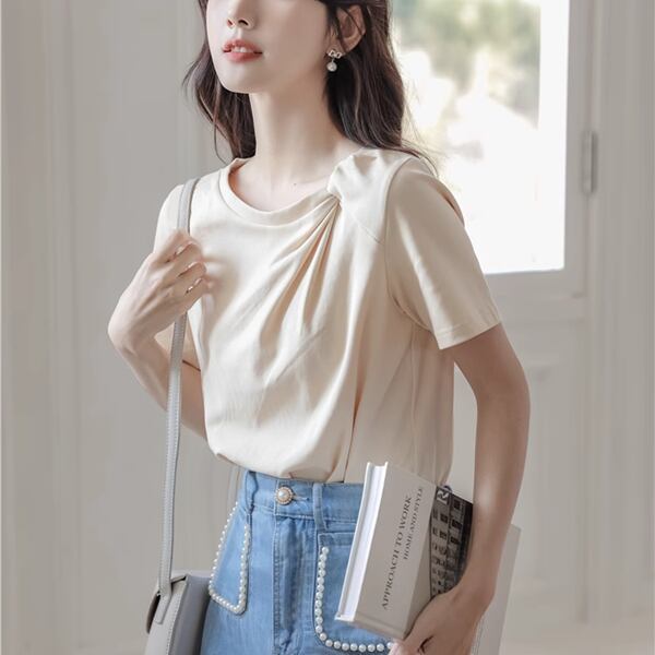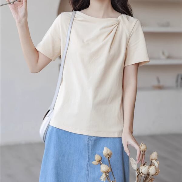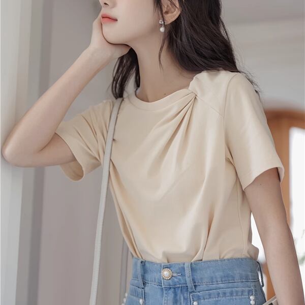 小さな新鮮な無地のシンプルなトップ、 024 夏の新デザイン、半袖Tシャツ!襟部分のツイストデザインが上品なアクセントとなり、シンプルながらもおしゃれな印象を与えてくれます。さらっとした着心地と着用しやすいデザインで、デイリーコーディネートに重宝すること間違いなし!夏の暑い日にも涼しく着こなせるので、季節感を楽しむコーディネートにピッタリです。